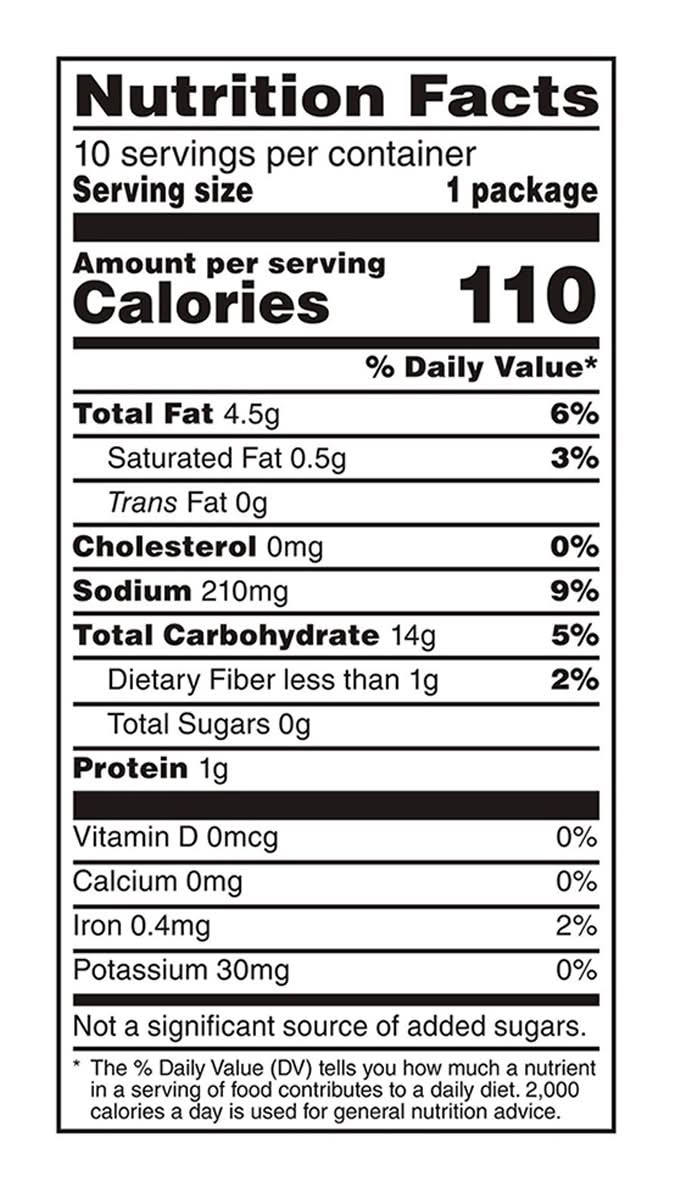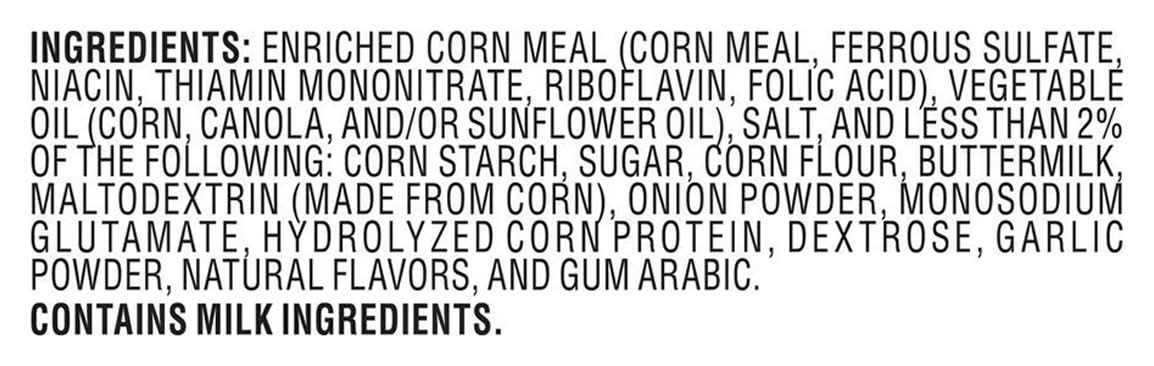 Ingredients: Enriched Corn Meal (Corn Meal, Ferrous Sulfate, Niacin, Thiamin Mononitrate, Riboflavin, Folic Acid), Vegetable Oil (Corn, Canola, and/or Sunflower Oil), Salt, and Less than 2% of the Following: Corn Starch, Sugar, Corn Flour, Buttermilk, Maltodextrin (Made from Corn), Onion Powder, Monosodium Glutamate, Hydrolyzed Corn Protein, Dextrose, Garlic Powder, Natural Flavors, and Gum Arabic Contains: Corn, Milk