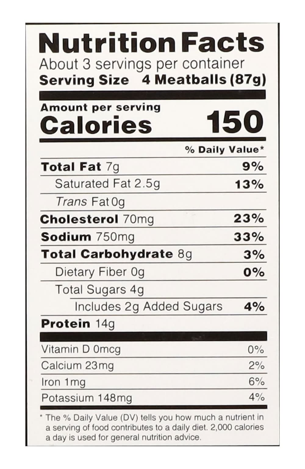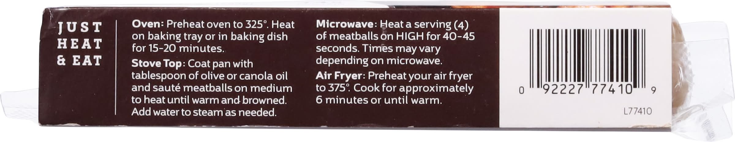 Directions for use: Just Heat & Eat: Oven: Preheat oven to 325 degrees. Heat on baking tray or in baking dish for 15-20 minutes. Stove Top: Coat pan with tablespoon of olive or canola oil and sauté meatballs on medium. to heat until warm and browned. Add water to steam as needed. Microwave: Heat a serving (4) of meatballs on HIGH for 40-45 seconds. Times may vary depending on microwave. Air Fryer: Preheat your air fryer to 375 degrees. Cook for approximately 6 minutes or until warm. Keep refrigerated. After package is opened, use within 4 days. meatballs may be frozen up to 6 months. Storage recommendation: Keep refrigerated.