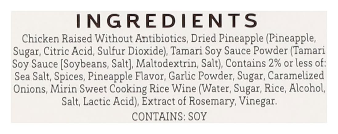 Ingredients: Chicken Raised Without Antibiotics, Dried Pineapple (Pineapple, Sugar, Citric Acid, Sulfur Dioxide), Tamari Soy Sauce Powder (Tamari Soy Sauce [Soybeans, Salt], Maltodextrin, Salt), Contains 2% or Less of: Sea Salt, Spices, Pineapple Flavor, Garlic Powder, Sugar, Caramelized Onions, Mirin Sweet Cooking Rice Wine (Water, Sugar, Rice, Alcohol, Salt, Lactic Acid), Extract of Rosemary, Vinegar Contains: Soybeans