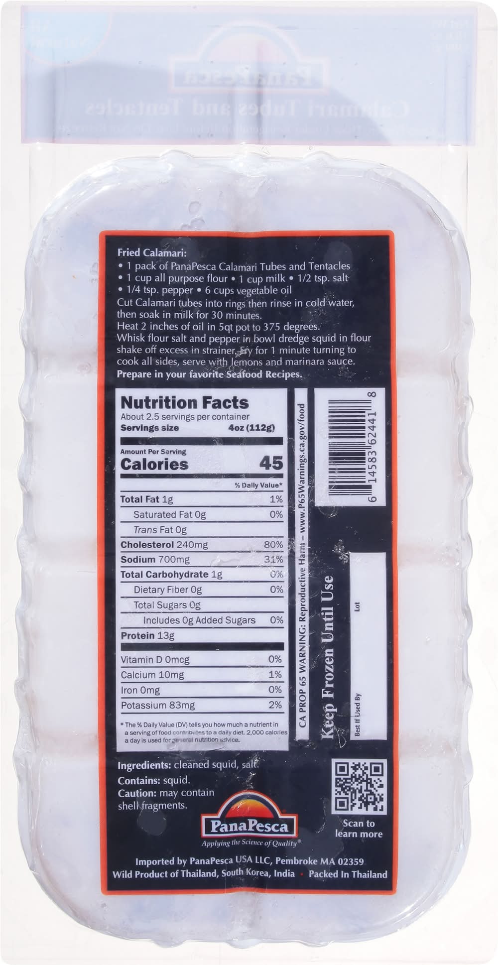 Directions for use: Fried Calamari: 1 Pack of PanaPesca Calamari Tubes and Tentacles. 1 cup All purpose flour. 1 cup Milk. 1/2 tsp. Salt. 1/4 tsp. Pepper. 6 cups Vegetable oil. Cut Calamari tubes into rings then rinse in cold water, then soak in milk for 30 minutes. Heat 2 inches of oil in 5 qt pot to 375 degrees. Whisk flour salt and pepper in bowl dredge squid in flour shake off excess in strainer. Fry for 1 minute turning to cook all sides, serve with lemons and marinara sauce. Prepare in your favorite Seafood Recipes. Keep frozen, thaw under refrigeration before use, do not refreeze. Keep frozen until use. Storage recommendation: Keep frozen, thaw under refrigeration before use, do not refreeze. Keep frozen until use.
