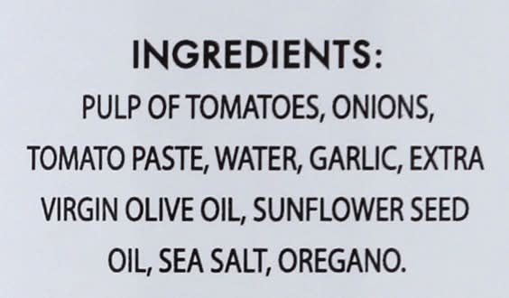 Ingredients: Pulp of Tomatoes, Onion, Tomato Paste, Water, Garlic, Extra Virgin Olive Oil, Sunflower Seed Oil, Sea Salt, Oregano