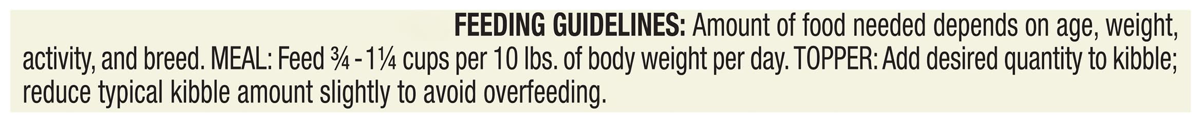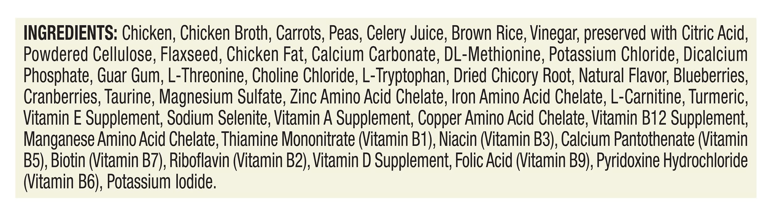 Ingredients: Chicken, Chicken Broth, Carrots, Peas, Celery Juice, Brown Rice, Vinegar, Preserved with Citric Acid, Powdered Cellulose, Flaxseed, Chicken Fat, Calcium Carbonate, DL-Methionine, Potassium Chloride, Dicalcium Phosphate, Guar Gum, L-Threonine, Choline Chloride, L-Tryptophan, Dried Chicory Root, Natural Flavor, Blueberries, Cranberries, Taurine, Magnesium Sulfate, Zinc Amino Acid Chelate, Iron Amino Acid Chelate, L-Carnitine, Turmeric, Vitamin E Supplement, Sodium Selenite, Vitamin A Supplement, Copper Amino Acid Chelate, Vitamin B12 Supplement, Manganese Amino Acid Chelate, Thiamine Mononitrate (Vitamin B1), Niacin (Vitamin B3), Calcium Pantothenate (Vitamin B5), Biotin (Vitamin B7), Riboflavin (Vitamin B2), Vitamin D Supplement, Folic Acid (Vitamin B9), Pyridoxine Hydrochloride (Vitamin B6), Potassium Iodide Contains: Celery