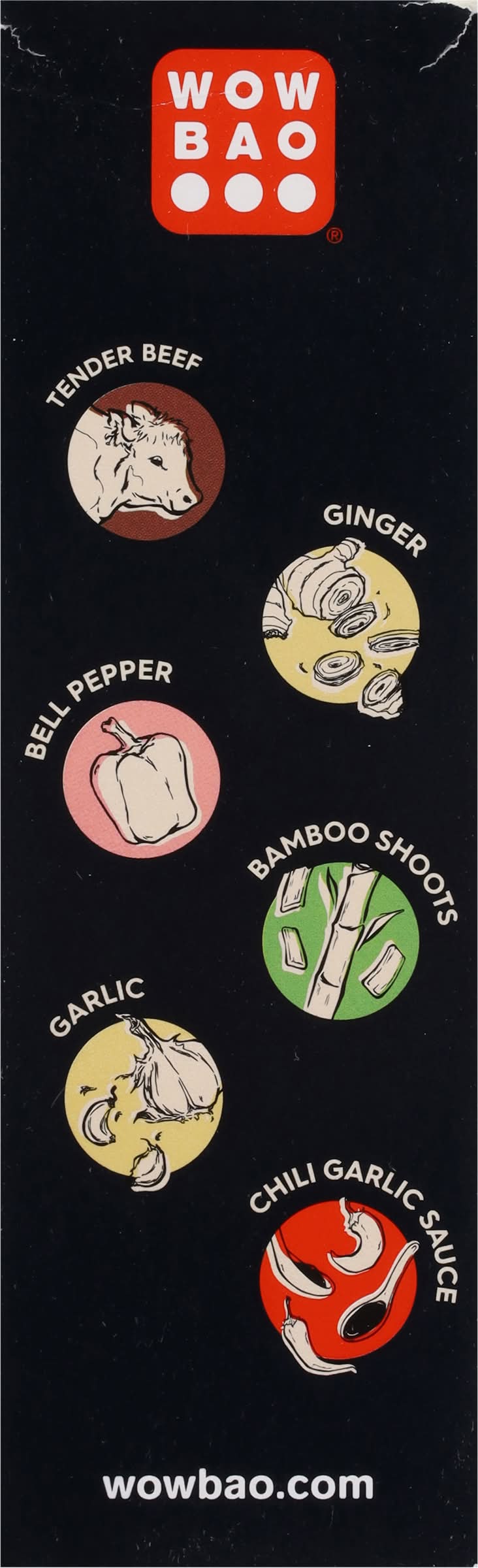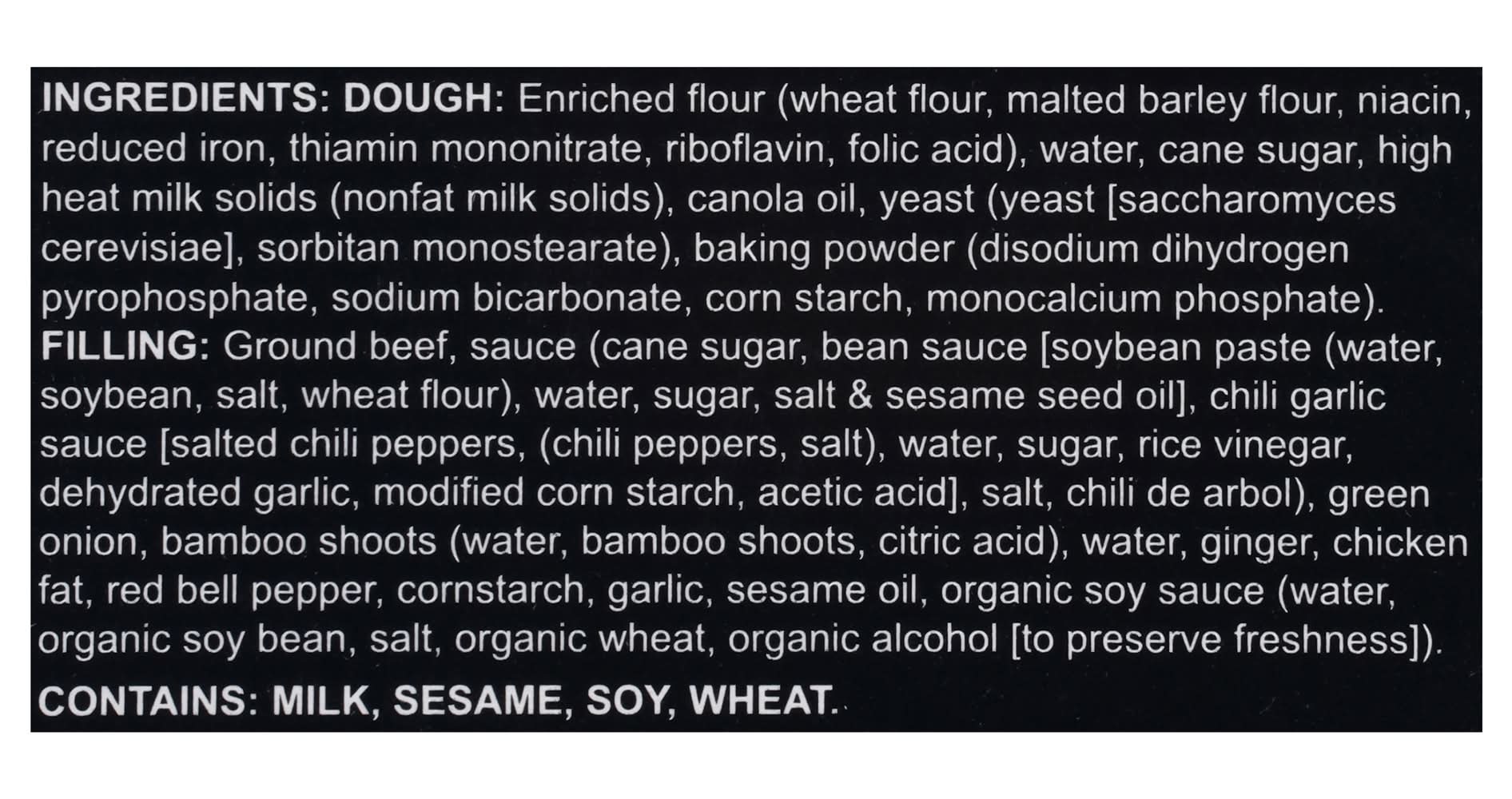 Ingredients: Dough: Enriched Flour (Wheat Flour, Malted Barley Flour, Niacin, Reduced Iron, Thiamin Mononitrate, Riboflavin, Folic Acid), Water, Cane Sugar, High Heat Milk Solids (Nonfat Milk Solids), Canola Oil, Yeast (Yeast [Saccharomyces Cerevisiae], Sorbitan Monostearate), Baking Powder (Disodium Dihydrogen Pyrophosphate, Sodium Bicarbonate, Corn Starch, Monocalcium Phosphate), Filling: Ground Beef, Sauce (Cane Sugar, Bean Sauce [Soybean Paste (Water, Soybean, Salt, Wheat Flour), Water, Sugar, Salt & Sesame Seed Oil], Chili Garlic Sauce [Salted Chili Peppers, (Chili Peppers, Salt), Water, Sugar, Rice Vinegar, Dehydrated Garlic, Modified Corn Starch, Acetic Acid], Salt, Chili De Arbol), Green Onion, Bamboo Shoots (Water, Bamboo Shoots, Citric Acid), Water, Ginger, Chicken Fat, Red Bell Pepper, Cornstarch, Garlic, Sesame Oil, Organic Soy Sauce (Water, Organic Soy Bean, Salt, Organic Wheat, Organic Alcohol [to Preserve Freshness]) Contains: Milk, Sesame, Soybeans, Wheat, Barley