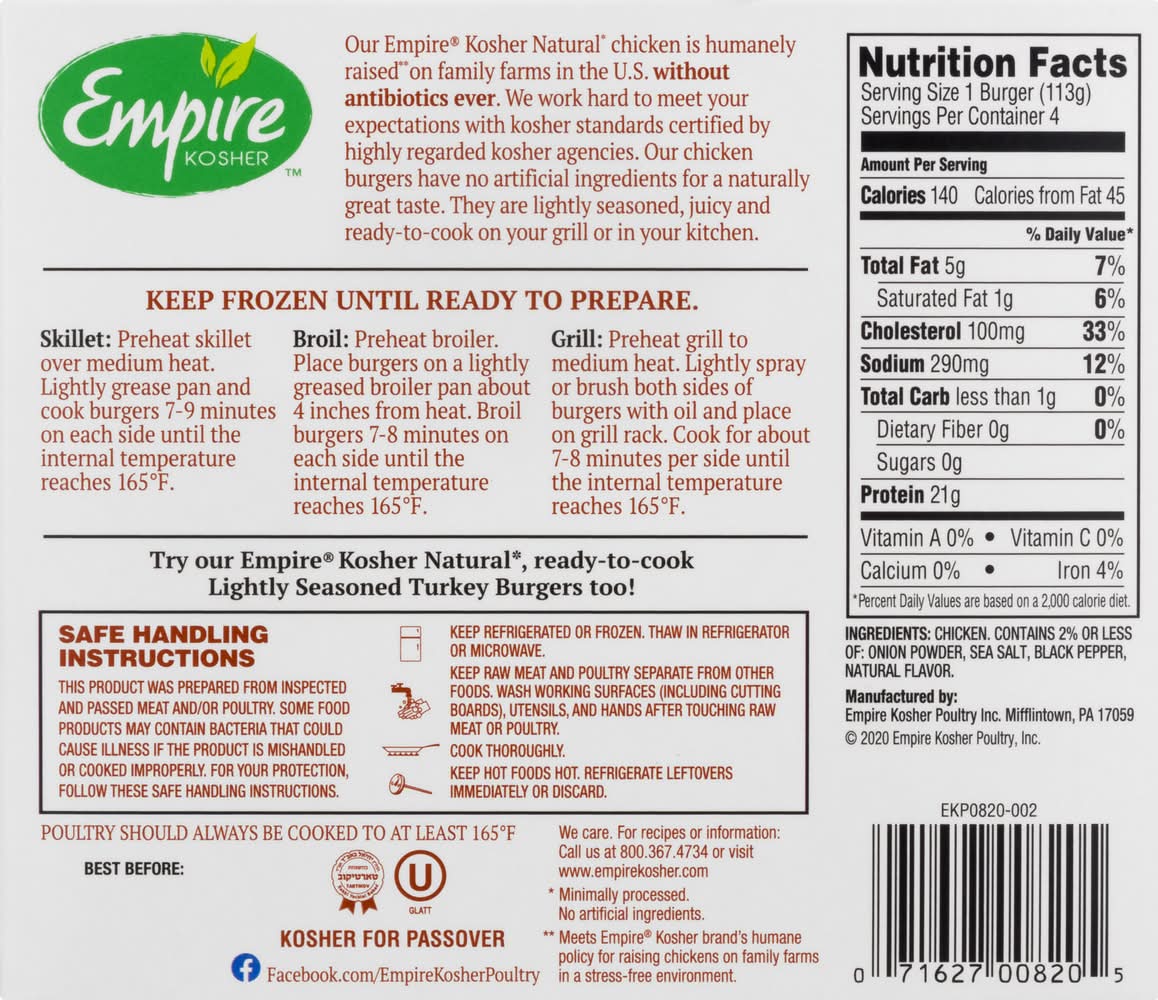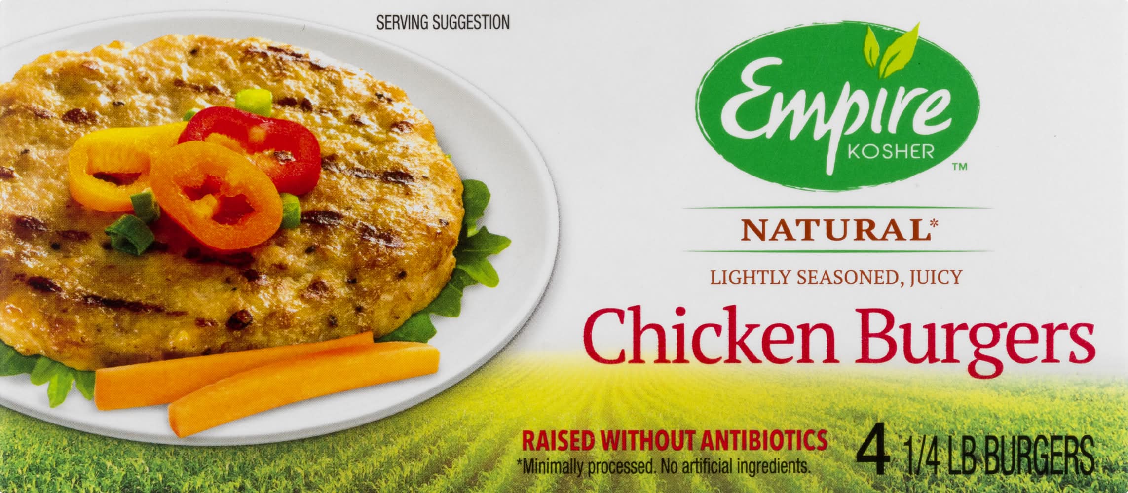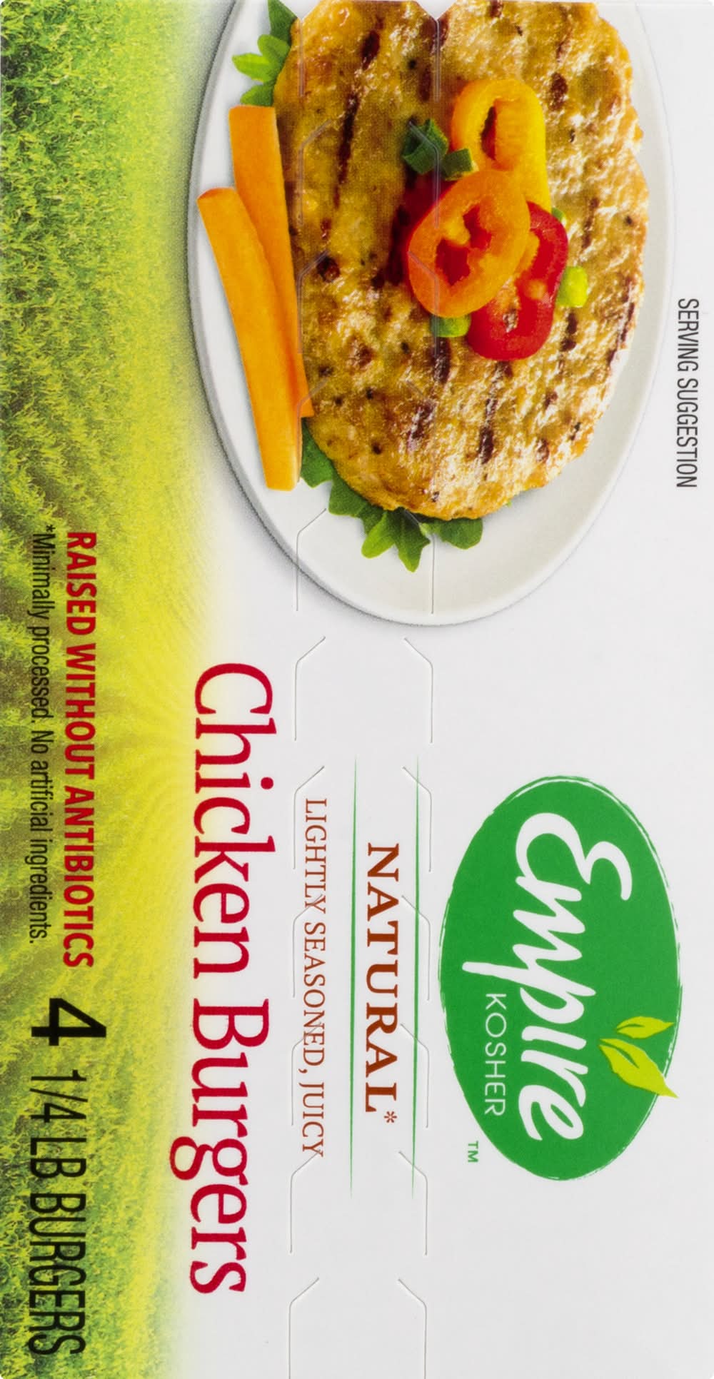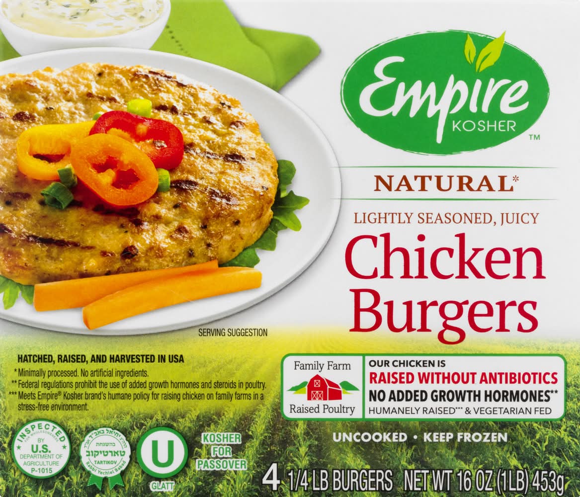 Natural (minimally processed. No artificial ingredients). No added growth hormones (federal regulations prohibit the use of added growth hormones and steroids in poultry). Humanely raised (meets Empire kosher brand’s humane policy for raising chicken on family farms in a stress-free environment) & Vegetarian Fed. Natural (minimally processed. No artificial ingredients). Uncooked. Family farm raised poultry. Our chicken is raised without antibiotics. Chicken is humanely raise (meets Empire Kosher brand’s humane policy for raising chicken on family farms in a stress-free environment). on family farms in the U.S. without antibiotics ever. We work hard to meet your expectations with kosher standards certified by highly regarded kosher agencies. Our chicken burgers have no artificial ingredients for a naturally great taste. They are lightly seasoned, juicy and ready-to-cook on your grill or in your kitchen. Inspected for wholesomeness by US Department of Agriculture. www.empirekosher.com. Facebook Facebook.com/EmpireKosherPoultry. We care. For recipes or information: call us at 800.367.4734 or visit www.empirekosher.com. Try our Empire kosher natural (minimally processed. No artificial ingredients), ready-to-cook lightly seasoned turkey burgers too. Hatched, raised, and harvested in USA.