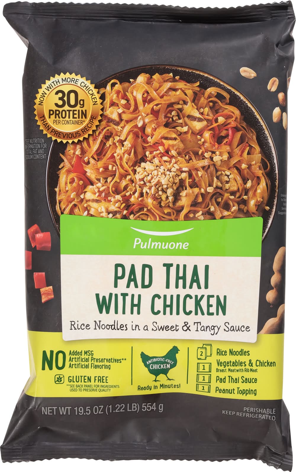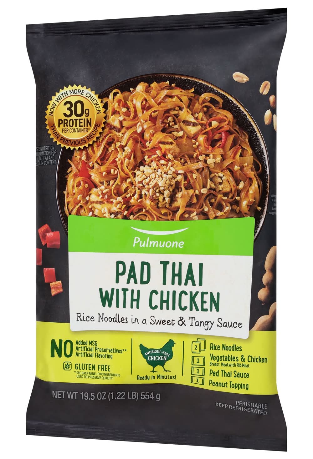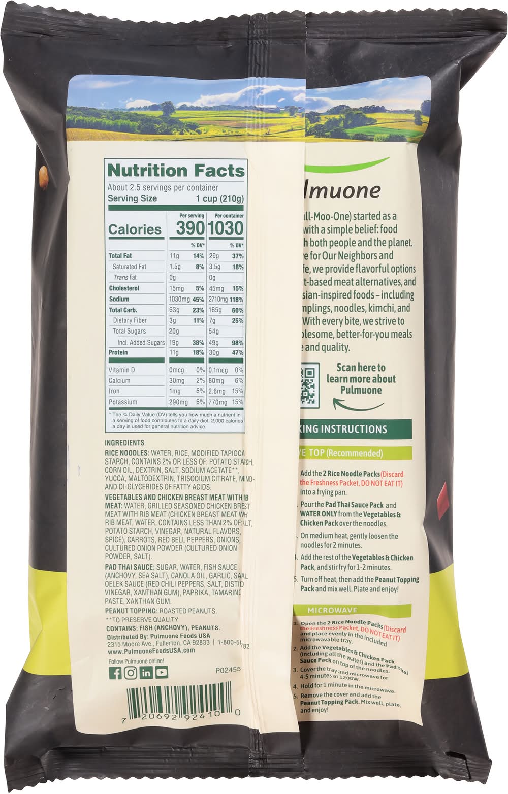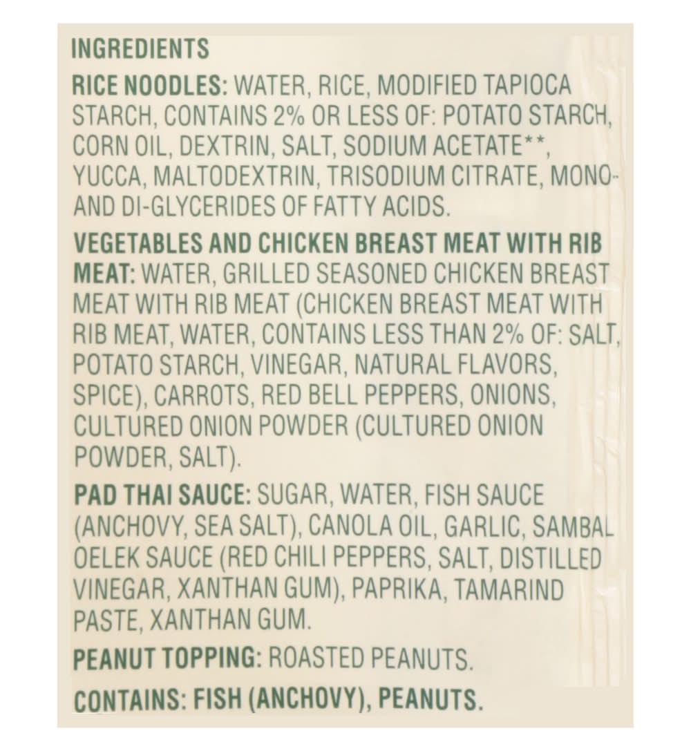 Ingredients: Rice Noodles: Water, Rice, Modified Tapioca Starch, Contains 2% or Less of: Potato Starch, Corn Oil, Dextrin, Salt, Sodium Acetate**, Yucca, Maltodextrin, Trisodium Citrate, Mono – and Di-Glycerides of Fatty Acids, Vegetable and Chicken Breast Meat with Rib Meat: Water. Grilled Seasoned Chicken Breast Meat with Rib Meat (Chicken Breast Meat with Rib Meat, Water, Contains Less than 2% of: Salt, Potato Starch, Vinegar, Natural Flavors, Spice), Carrots, Red Bell Peppers, Onions, Cultured Onion Powder (Cultured Onion Powder, Salt). Pad Thai Sauce: Sugar, Water, Fish Sauce (Anchovy, Sea Salt), Canola Oil, Garlic, Sambal Oelek Sauce (Red Chili Peppers, Salt, Distilled Vinegar, Xanthan Gum), Paprika, Tamarind Paste, Xanthan Gum. Peanut Topping: Roasted Peanuts. ** To Preserve Quality Contains: Fish, Anchovy, Peanuts