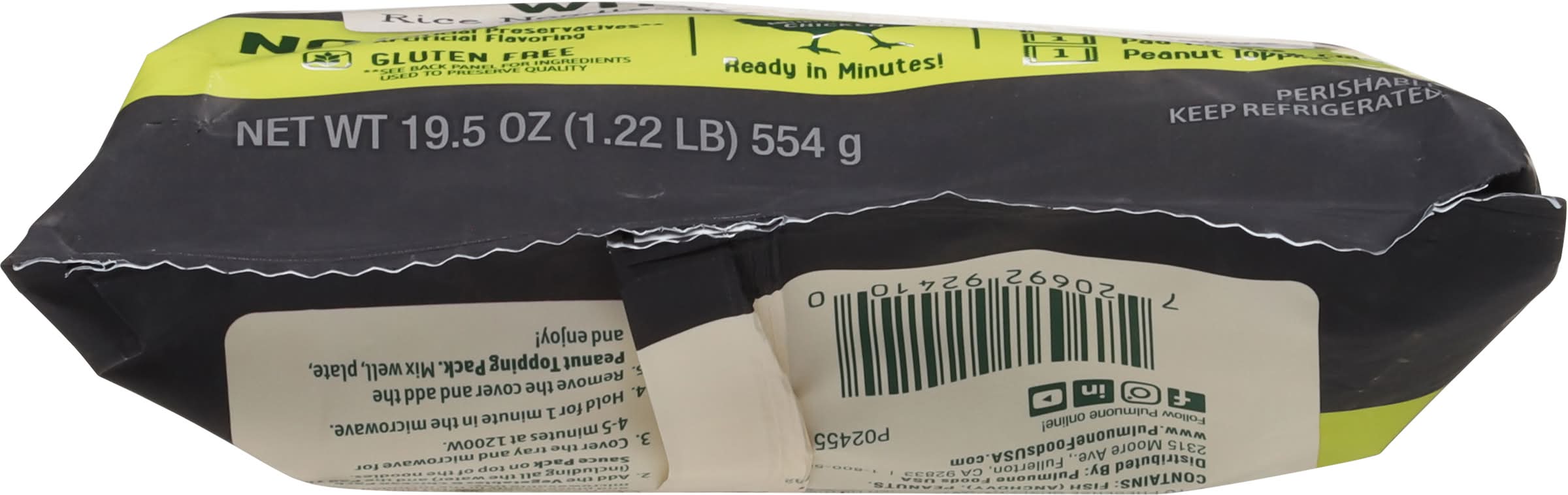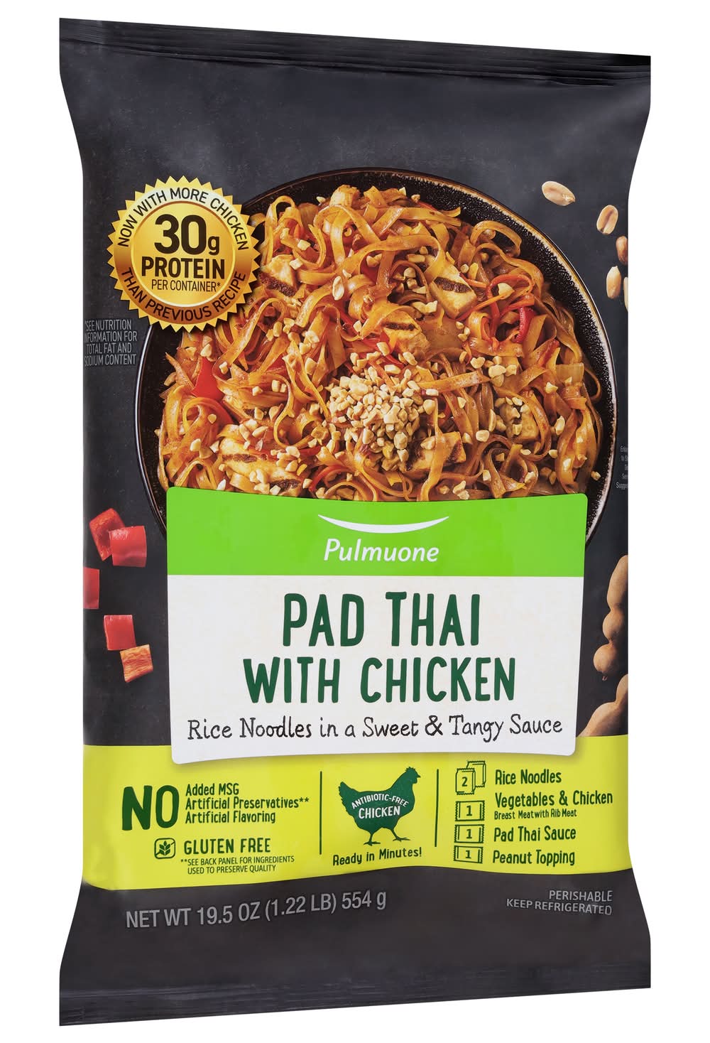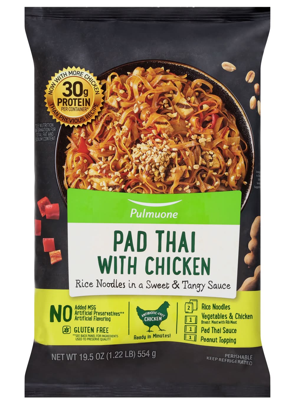 Ingredients: Rice Noodles: Water, Rice, Modified Tapioca Starch, Contains 2% or Less of: Potato Starch, Corn Oil, Dextrin, Salt, Sodium Acetate**, Yucca, Maltodextrin, Trisodium Citrate, Mono – and Di-Glycerides of Fatty Acids, Vegetable and Chicken Breast Meat with Rib Meat: Water. Grilled Seasoned Chicken Breast Meat with Rib Meat (Chicken Breast Meat with Rib Meat, Water, Contains Less than 2% of: Salt, Potato Starch, Vinegar, Natural Flavors, Spice), Carrots, Red Bell Peppers, Onions, Cultured Onion Powder (Cultured Onion Powder, Salt). Pad Thai Sauce: Sugar, Water, Fish Sauce (Anchovy, Sea Salt), Canola Oil, Garlic, Sambal Oelek Sauce (Red Chili Peppers, Salt, Distilled Vinegar, Xanthan Gum), Paprika, Tamarind Paste, Xanthan Gum. Peanut Topping: Roasted Peanuts. ** To Preserve Quality Contains: Fish, Anchovy, Peanuts