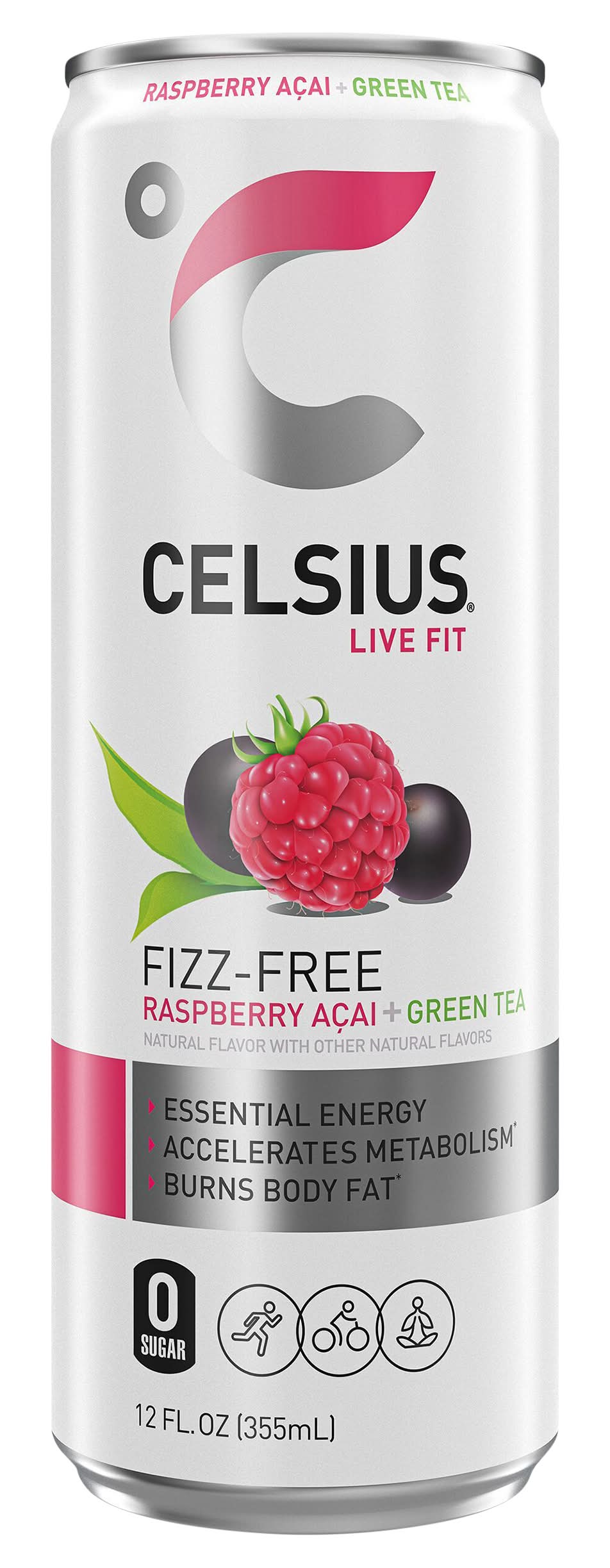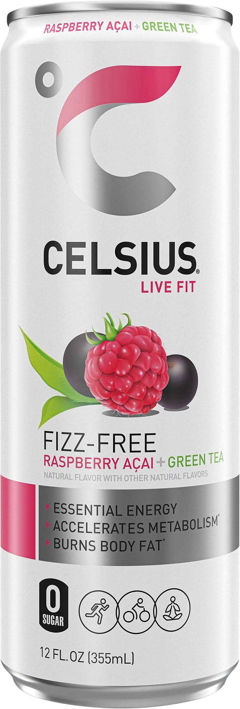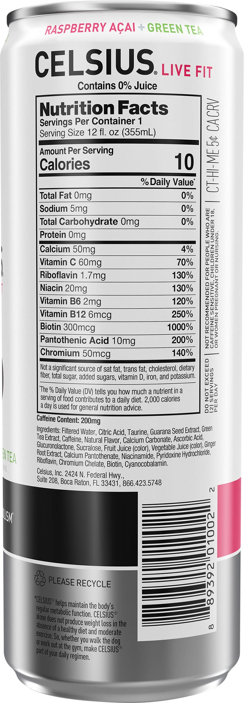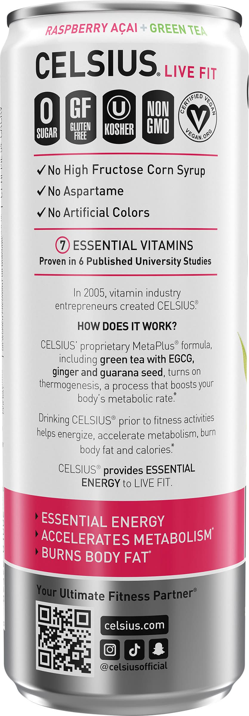 Natural flavor with other natural flavors. Caffeine Content: 200 mg. 0 sugar. Gluten free. Certified vegan. vegan.org. Non GMO. Essential energy. Accelerates metabolism (Celsius helps maintain the body's regular metabolic function. Celsius alone does not produce weight loss in the absence of a healthy diet and moderate exercise. So, whether you walk the dog or work out at the gym, make Celsius part of your daily regimen). Burns body fat (Celsius helps maintain the body's regular metabolic function. Celsius alone does not produce weight loss in the absence of a healthy diet and moderate exercise. So, whether you walk the dog or work out at the gym, make Celsius part of your daily regimen). No high fructose corn syrup. No aspartame. 7 essential vitamins proven in 6 published university studies. In 2005, vitamin industry entrepreneurs created Celsius. How does it work? Celsius proprietary MetaPlus formula, including green tea with EGCG ginger and guarana seed, turns on thermogenesis, a process that boosts your body's metabolic rate (Celsius helps maintain the body's regular metabolic function. Celsius alone does not produce weight loss in the absence of a healthy diet and moderate exercise. So, whether you walk the dog or work out at the gym, make Celsius part of your daily regimen). Drinking Celsius prior to fitness activities is proven to energize, accelerate metabolism, burn body fat and calories (Celsius helps maintain the body's regular metabolic function. Celsius alone does not produce weight loss in the absence of a healthy diet and moderate exercise. So, whether you walk the dog or work out at the gym, make Celsius part of your daily regimen). • Flavor: Raspberry acai-green tea • Celsius Inc., 2424 N. Federal Hwy,Ste 208,Boca Raton,FL,33431 • Packaging: Reusable