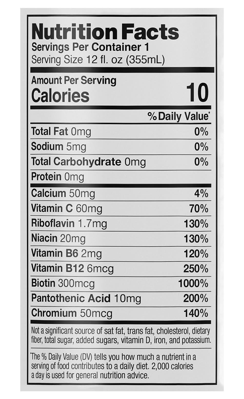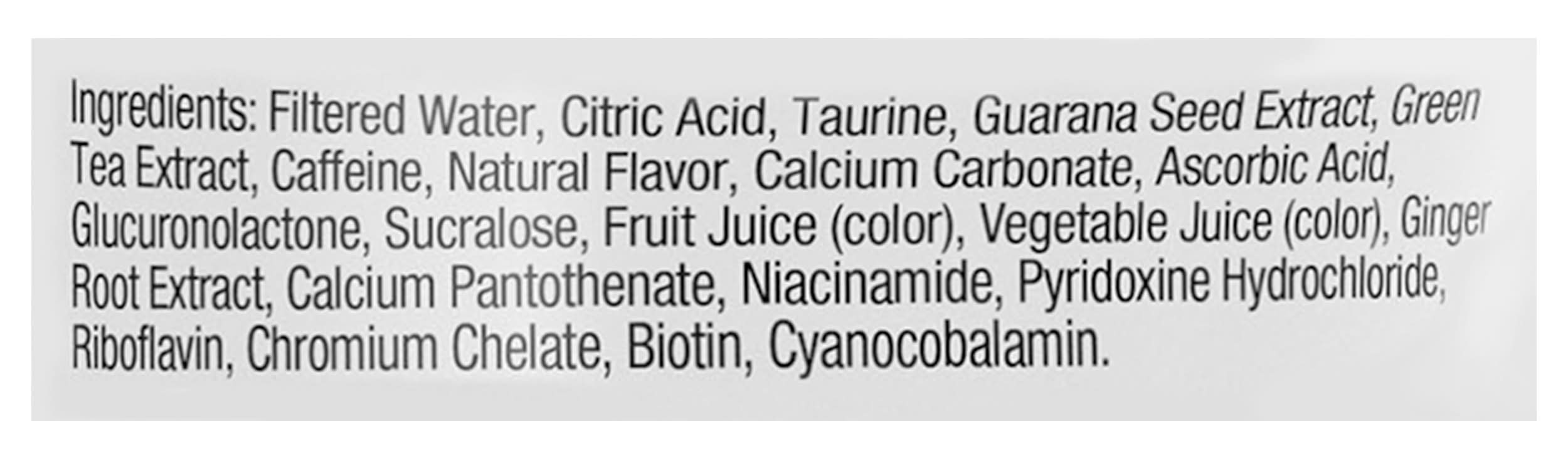 Ingredients: Filtered Water, Citric Acid, Taurine, Guarana Seed Extract, Green Tea Extract, Caffeine, Natural Flavor, Calcium Carbonate, Ascorbic Acid, Glucuronolactone, Sucralose, Fruit Juice (Color), Vegetable Juice (Color), Ginger Root Extract, Calcium Pantothenate, Niacinamide, Pyridoxine Hydrochloride, Riboflavin, Chromium Chelate, Biotin, Cyanocobalamin