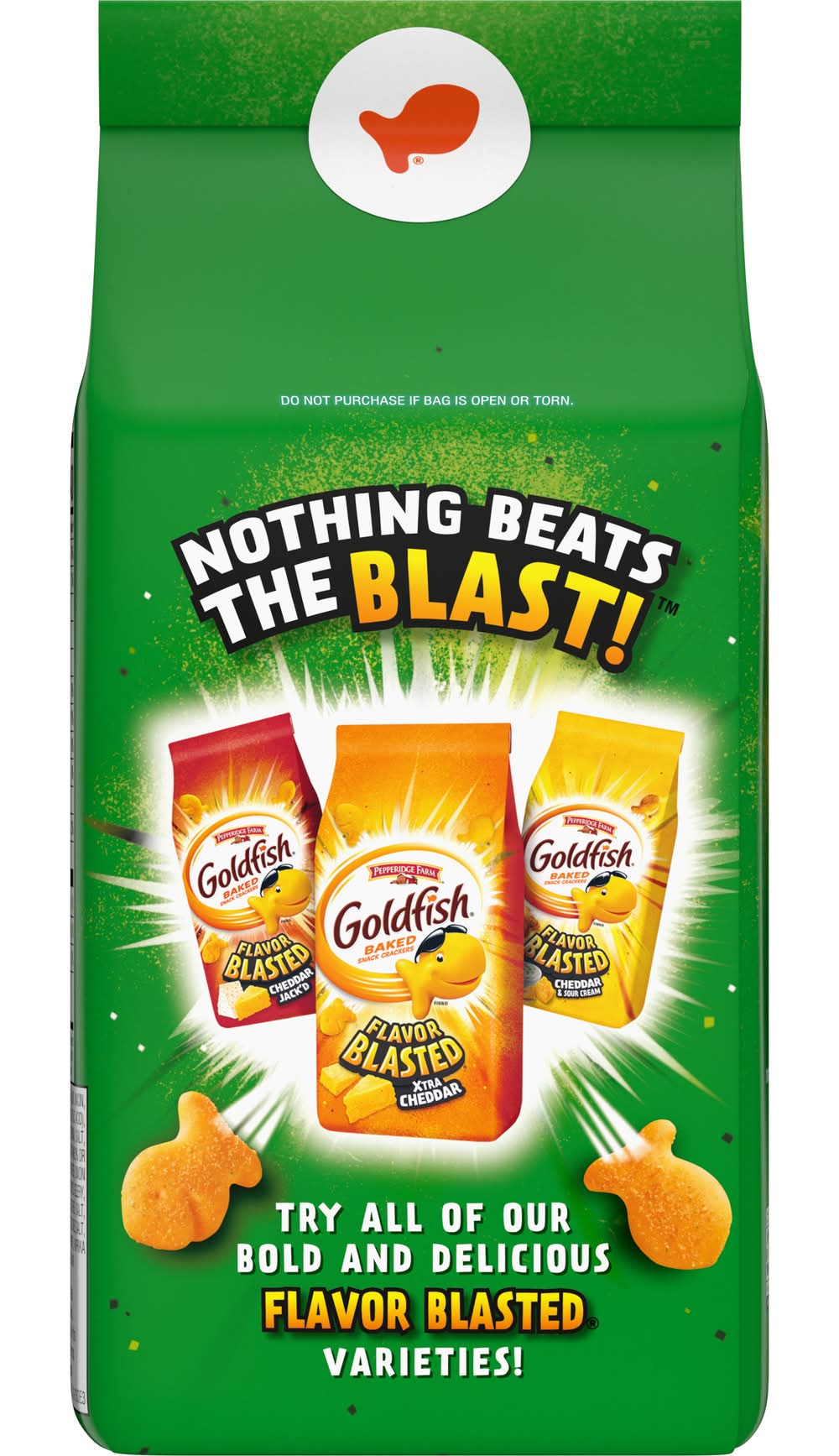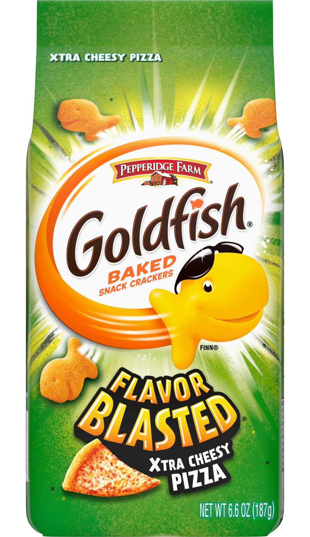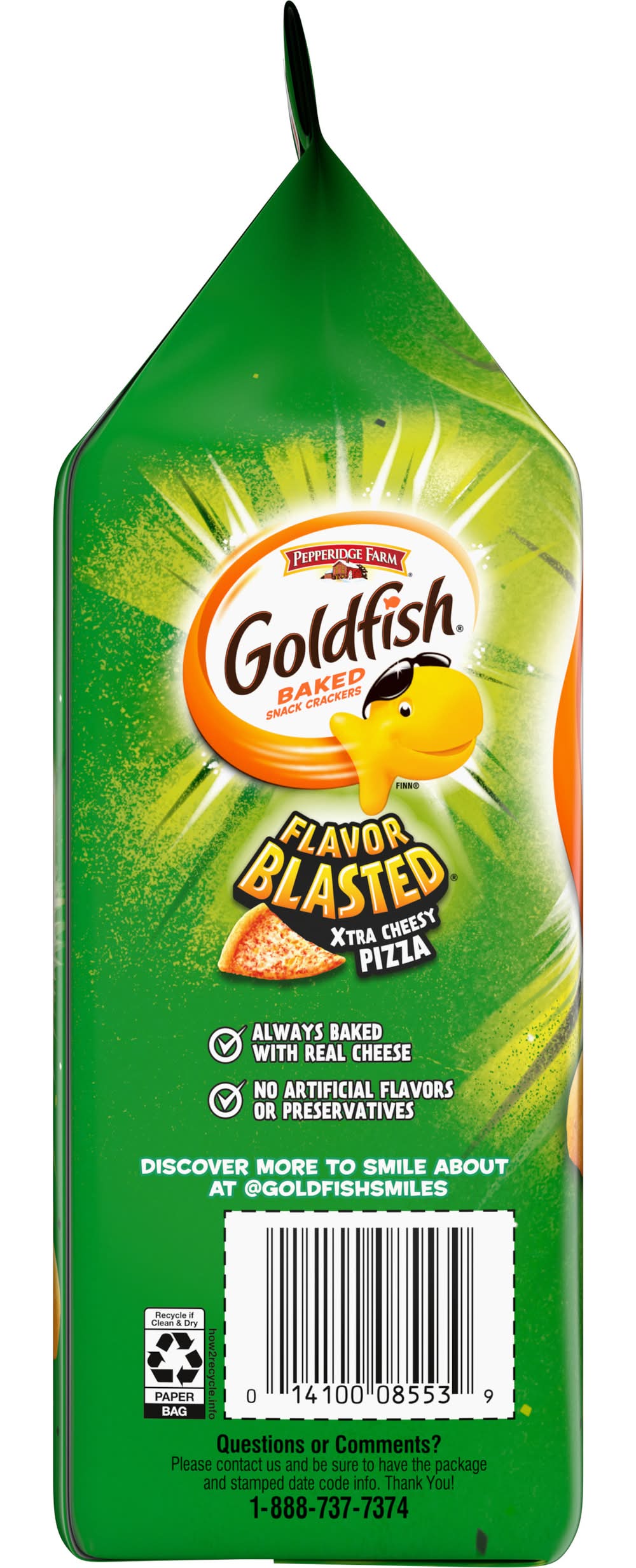 Kick snack time up a notch with the intense flavor of Goldfish Flavor Blasted Xtra Cheesy Pizza snack crackers. Like all of our cheese varieties, they’re always baked with real cheese, and are made with no artificial flavors or preservatives. So add a little fun to your snack time with this zesty and cheesy snack that’ll keep you coming back for more. They're also the perfect companion to add a crunchy, cheesy excitement to your meals. For lunch, add them to soups, sprinkle them on salads or just simply munch them as a side with your sandwich. Crumble them up and use them to bread chicken breasts for an exciting spin on dinner. From snack time to meal time, there are so many ways to enjoy the goodness of Goldfish. And if you are looking to add a little more flavor in your life, give our Flavor Blasted Sour Cream & Cheddar, Cheddar Jack’d or Xtra Cheddar a try. Go for the handful! • Pepperidge Farm, Inc., Norwalk,CT,06856 • Packaging: Reusable