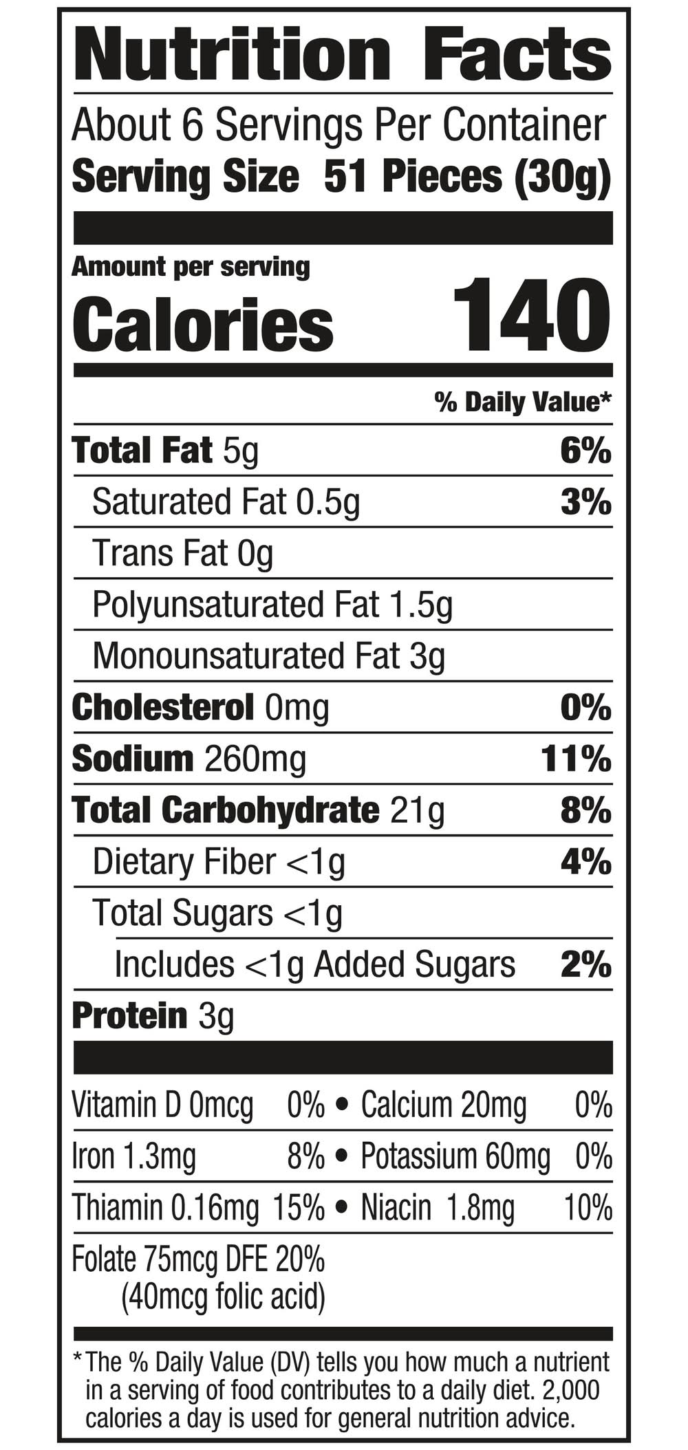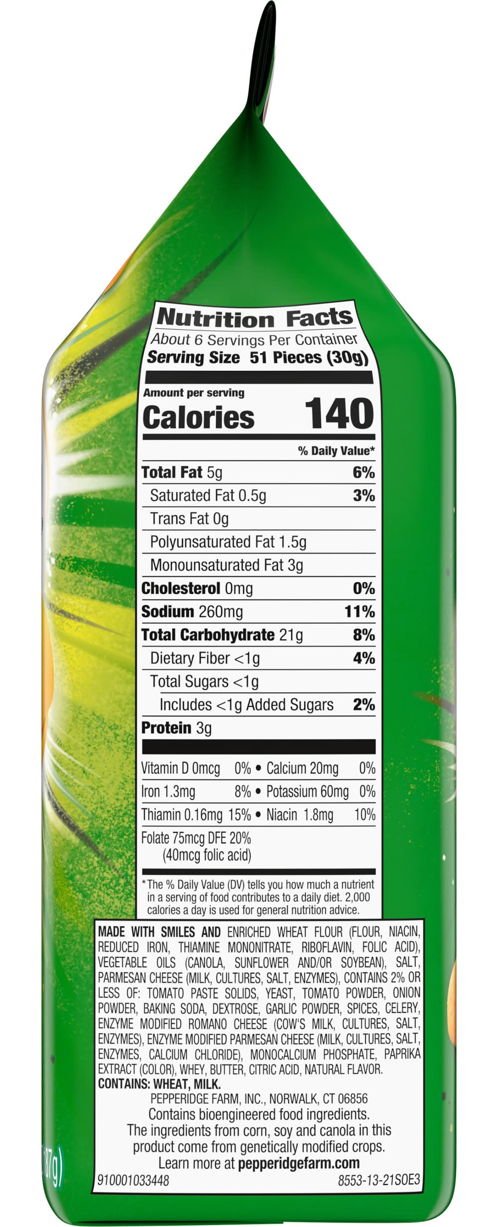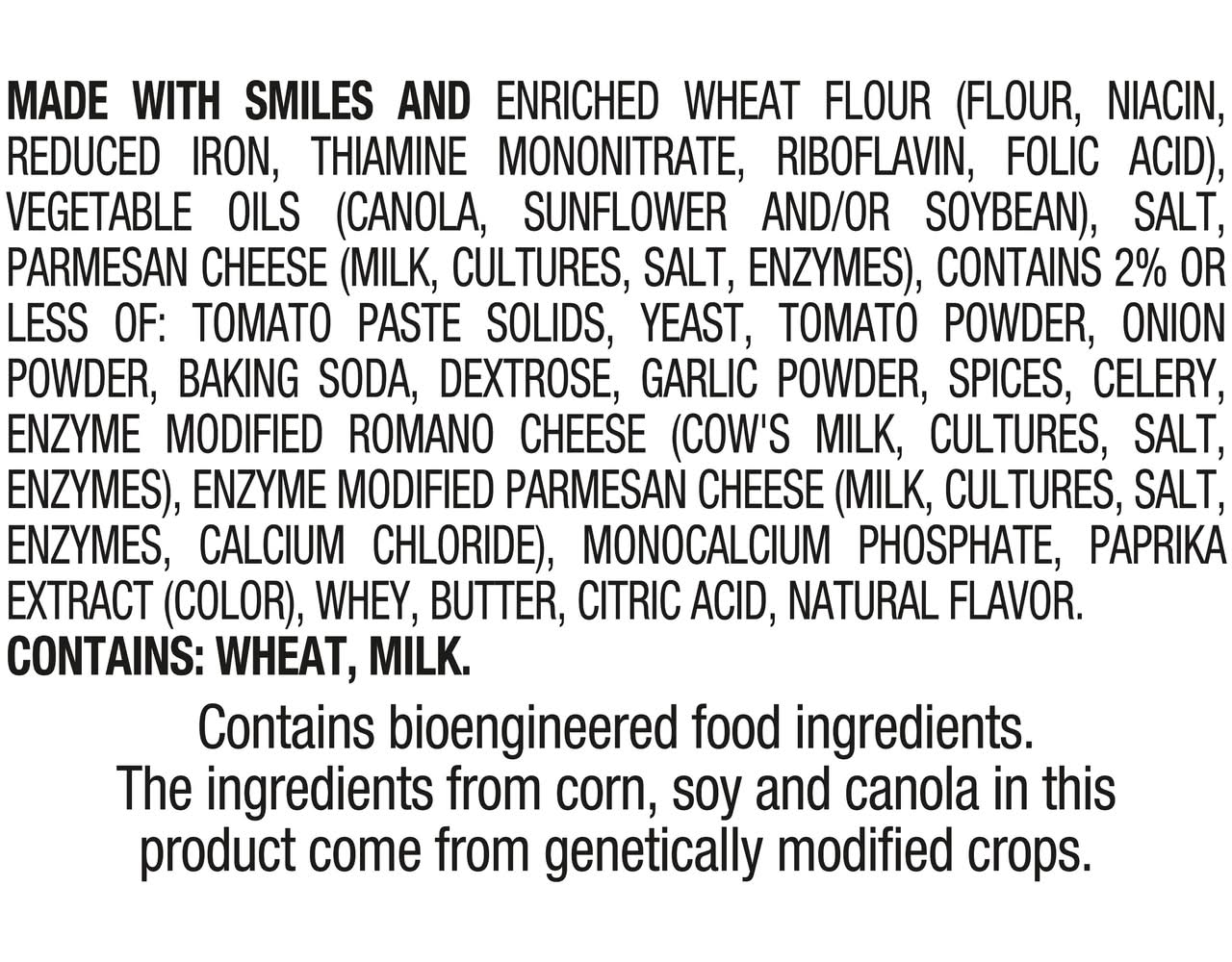 Ingredients: MADE WITH SMILES AND ENRICHED WHEAT FLOUR (FLOUR, NIACIN, REDUCED IRON, THIAMINE MONONITRATE, RIBOFLAVIN, FOLIC ACID), VEGETABLE OILS (CANOLA, SUNFLOWER AND/OR SOYBEAN), SALT, PARMESAN CHEESE (MILK, CULTURES, SALT, ENZYMES), CONTAINS 2% OR LESS OF: TOMATO PASTE SOLIDS, YEAST, TOMATO POWDER, ONION POWDER, BAKING SODA, DEXTROSE, GARLIC POWDER, SPICES, CELERY, ENZYME MODIFIED ROMANO CHEESE (COW'S MILK, CULTURES, SALT, ENZYMES), ENZYME MODIFIED PARMESAN CHEESE (MILK, CULTURES, SALT, ENZYMES, CALCIUM CHLORIDE), MONOCALCIUM PHOSPHATE, PAPRIKA EXTRACT (COLOR), WHEY, BUTTER, CITRIC ACID, NATURAL FLAVOR. CONTAINS: WHEAT, MILK. Contains: CONTAINS: Gluten, Milk/Dairy, Wheat