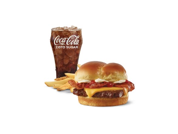 A quarter-pound* of fresh, never-frozen beef, American cheese, crispy Applewood smoked bacon, ketchup, and mayo on a toasted potato bun. Not as intensely bacon as it’s bigger, badder brother, but still pretty dang intensely bacon.