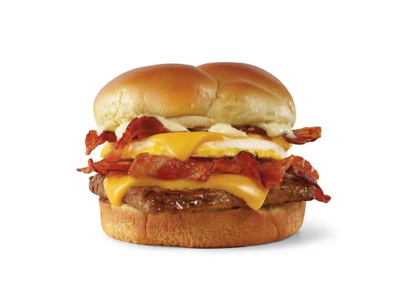 Grilled sausage, American cheese, Applewood smoked bacon, fresh-cracked grade A eggs, (deep breath) more cheese and more bacon all covered in swiss cheese sauce on a toasted potato bun. Don’t just break your fast. Destroy it.