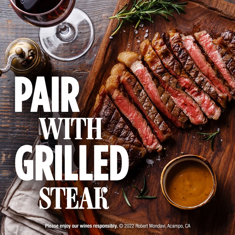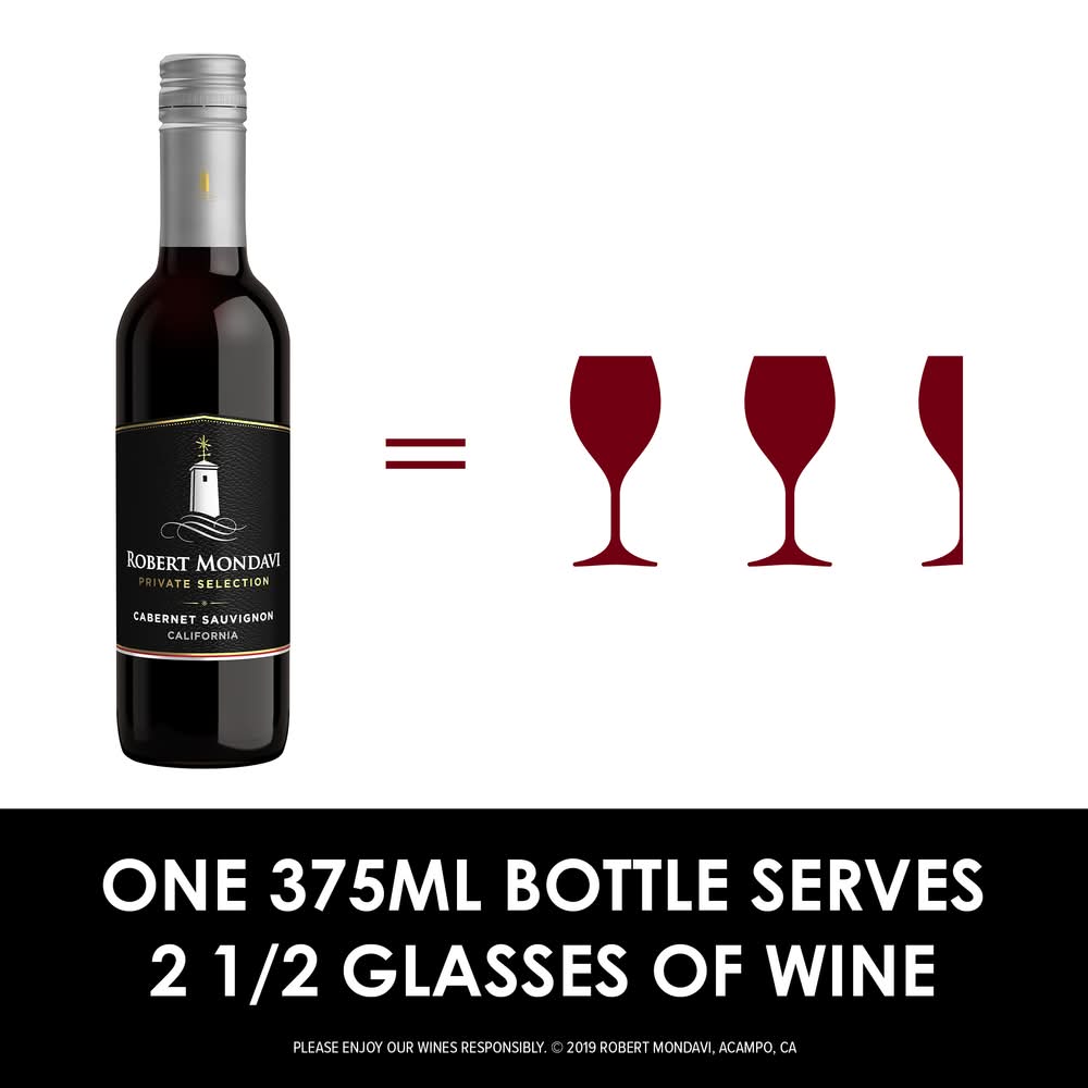 Robert Mondavi Private Selection Cabernet Sauvignon Red Wine offers fresh fruit character and bright acidity. This small bottle of wine opens with aromas of ripe black cherries, blackberries, red berry, and spice. Crafted with grapes grown in the cool climate of California's Central Coast vineyards along the Pacific Ocean, this medium-bodied wine is aged for 10 months in French and American oak barrels. This barrel aging, along with the red grapes' slow ripening process, imparts a pleasing complexity and depth of flavor to this Central Coast wine. With luscious flavors of ripe Bing cherries and blueberry, which are accented by toasty oak and hints of coffee and vanilla flavors, this delicious red wine pairs well with grilled lamb and steak, hearty pasta, strong cheeses, and a variety of other dishes. Feature this California red wine at a wine and cheese party, or enjoy a glass of wine on its own. For optimal taste, store at room temperature, but chill this 375 mL wine bottle – equal to half a standard 750 mL bottle – for 30 to 60 minutes and serve cool at approximately 60 degrees. Please enjoy our wines responsibly. 2023 Robert Mondavi Private Selection, Acampo, CA • Brand: Robert mondavi private selection • Category: Cabernet sauvignon • Alcohol by volume: 13.5%