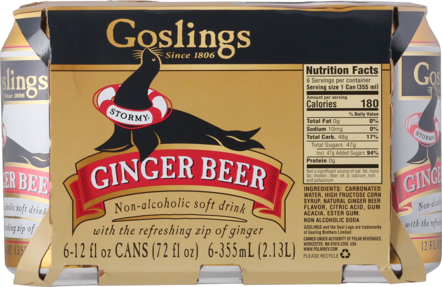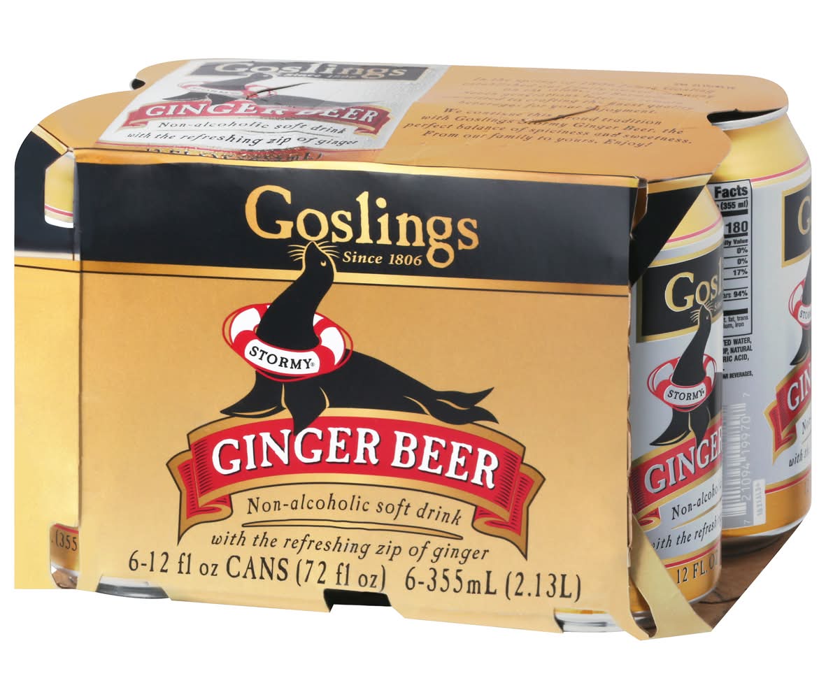 Non-alcoholic soft drink with the refreshing zip of ginger. Since 1806. Non-alcoholic soft drink with the refreshing zip of ginger. In the spring of 1806 James Gosling established our family owned company on the island of Bermuda. Seven generations later we remain committed to crafting the finest quality beverages for your enjoyment. We continue this proud tradition with Goslings Stormy Ginger Beer, the perfect balance of spiciness and sweetness. From our family to yours. • Pack size: 6 • Polar Beverages, MA, 01610 • Packaging: Reusable