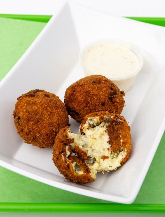 mixture of jalapeños, cream cheese, Mexican cheese blend, bacon, scallions, tossed in panko breadcrumbs. Served w/ranch or blue cheese.