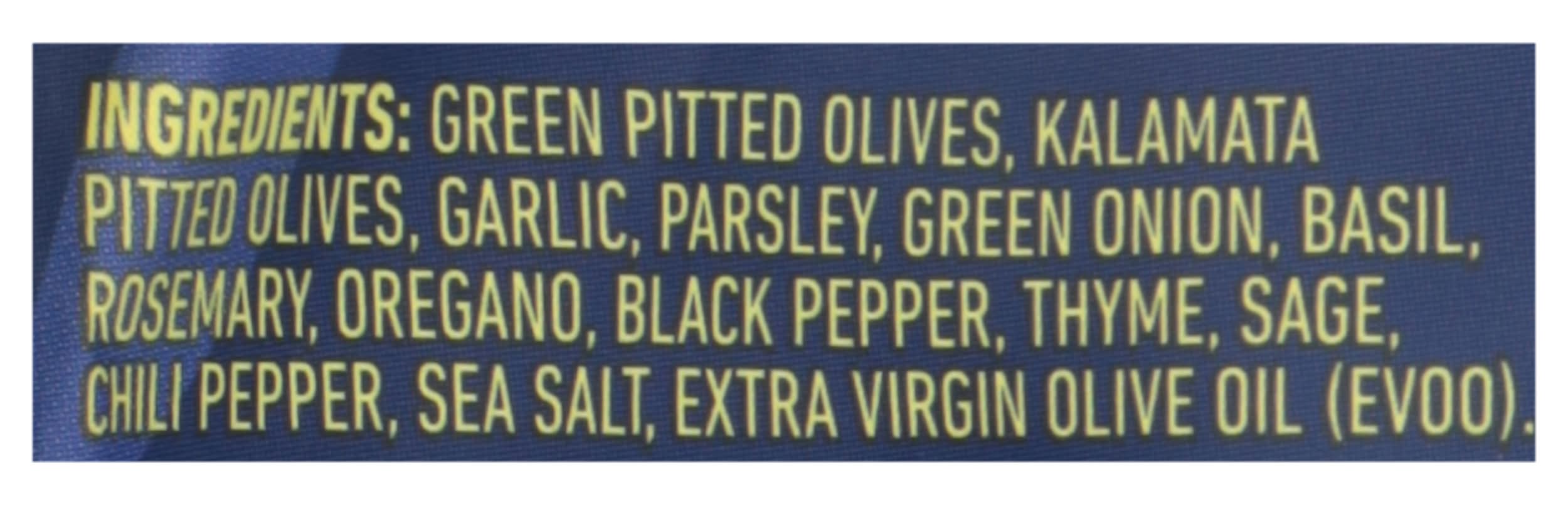 Ingredients: Green Pitted Olives, Kalamata Pitted Olives, Garlic, Parsley, Green Onion, Basil, Rosemary, Oregano, Black Pepper, Thyme, Sage, Chili Pepper, Sea Salt, Extra Virgin Olive Oil (EVOO)