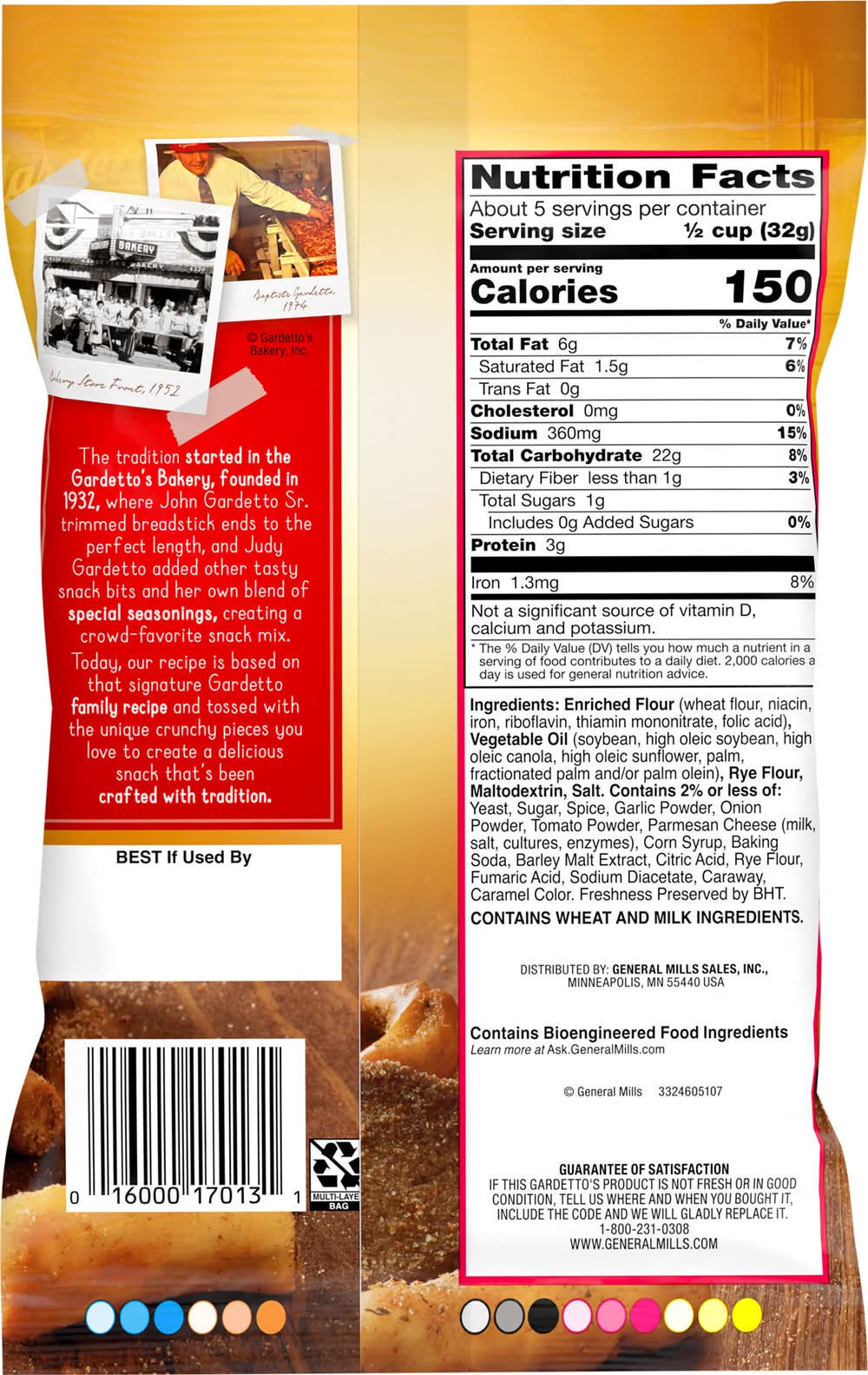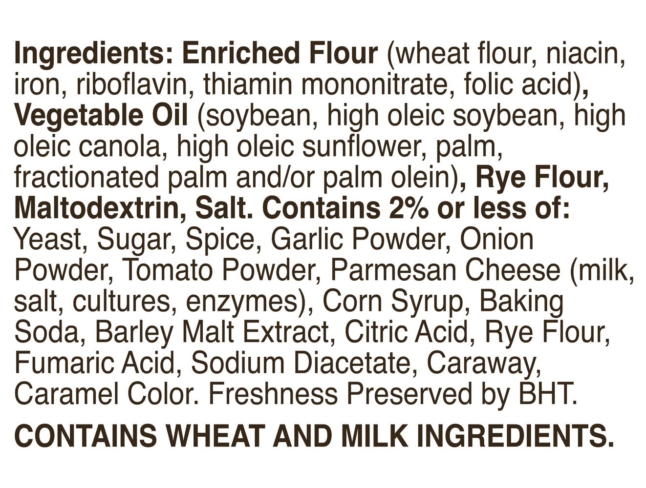 Ingredients: Enriched Flour (Wheat Flour, Niacin, Iron, Riboflavin, Thiamin Mononitrate, Folic Acid), Vegetable Oil (Soybean, High Oleic Soybean, High Oleic Canola, High Oleic Sunflower, Palm, Fractionated Palm and/or Palm Olein), Rye Flour, Maltodextrin, Salt, Contains 2% or Less of: Yeast, Sugar, Spice, Garlic Powder, Onion Powder, Tomato Powder, Parmesan Cheese (Milk, Salt, Cultures, Enzymes), Corn Syrup, Baking Soda, Barley Malt Extract, Citric Acid, Rye Flour, Fumaric Acid, Sodium Diacetate, Caraway, Caramel Color. Freshness Preserved by BHT Contains: Wheat, Milk, Soybeans, Barley, Rye