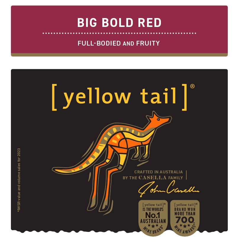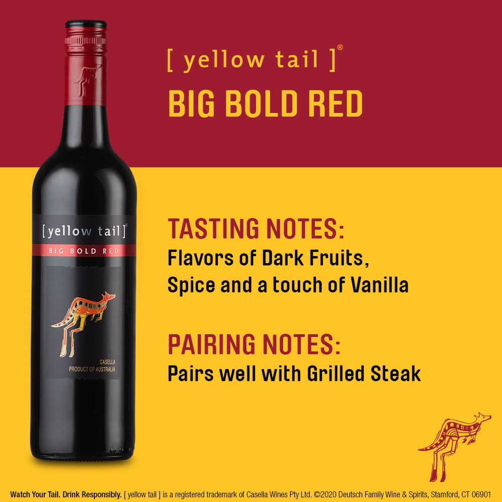 Made in South Eastern Australia, [ yellow tail ] Big Bold Red is a red wine blend that brings the flavors and essence of the region to your glass, ensuring a smile with each sip. This red blend is everything a great wine should be with its easy to drink, rich taste and fruity flavor profile. Featuring bold flavors of raspberry, strawberry and a touch of vanilla, this red wine is well-balanced, complex and enjoyed with a pepper steak or dessert. This bottle of wine is perfect for enjoying with friends and good conversation. [ yellow tail ] wine is wonderful for livening up casual dinners with loved ones and bringing a lighthearted spirit to any and every event and celebration. This [ yellow tail ] wine bottle. Great quality wine can be affordable and good fun too. We like our wines to be vibrant, flavorsome and approachable, making everyday moments even more enjoyable. A wine for any occasion, [ yellow tail ] is easy to choose, drink and enjoy. • Alcohol by volume: 13.5% • Deutsch Family, Stamford, CT