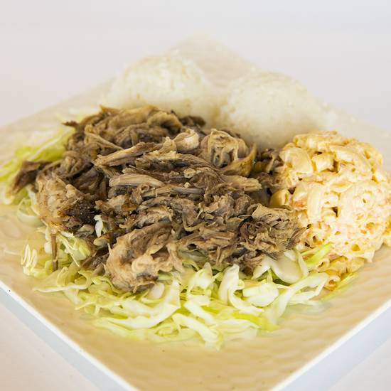 Smoked shredded pork. Served with two scoops of rice and one scoop of macaroni salad.