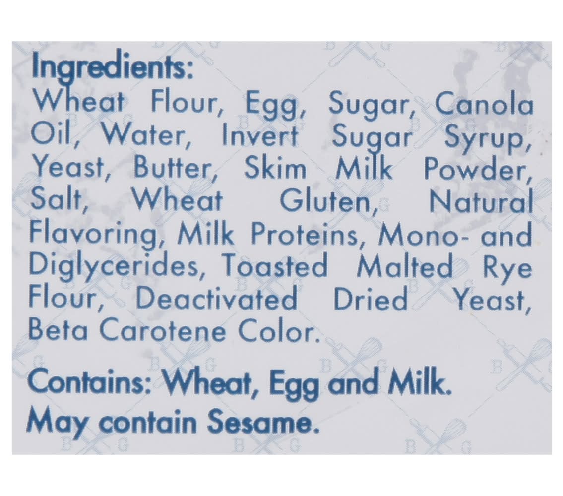 Ingredients: Wheat Flour, Egg, Sugar, Canola Oil, Water, Invert Sugar Syrup, Yeast, Butter, Skim Milk Powder, Salt, Wheat Gluten, Natural Flavoring, Milk Proteins, Mono- and Diglycerides, Toasted Malted Rye Flour, Deactivated Dried Yeast, Beta Carotene Color Contains: Wheat, Eggs, Milk, Gluten, Sesame