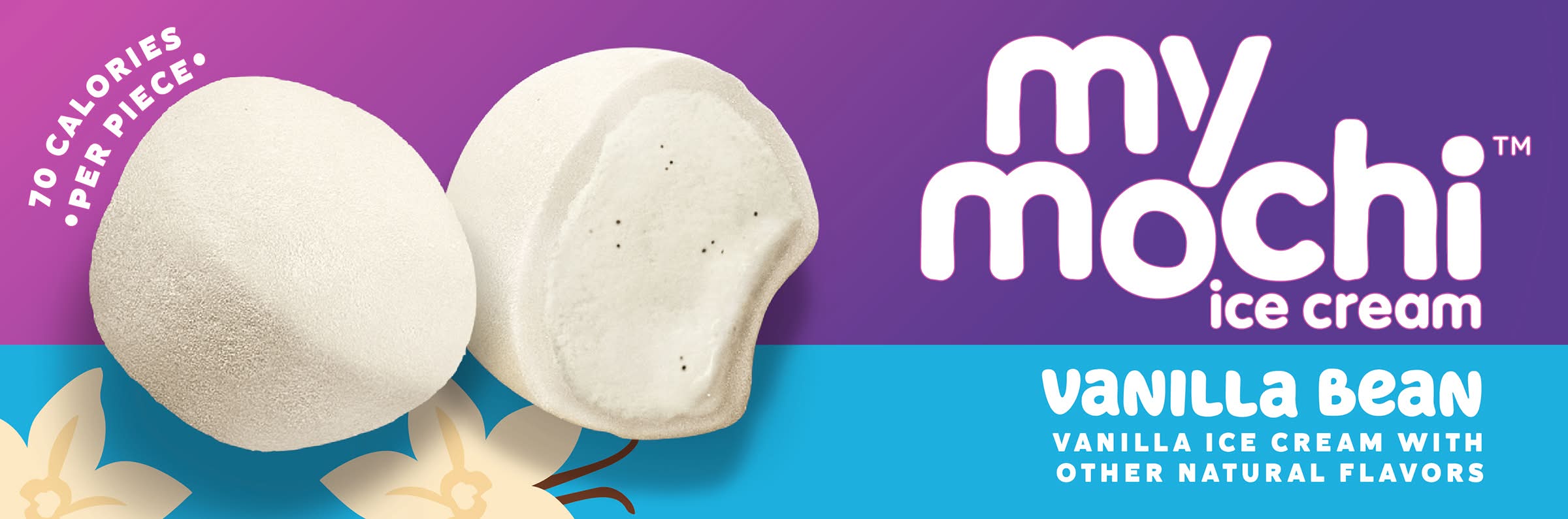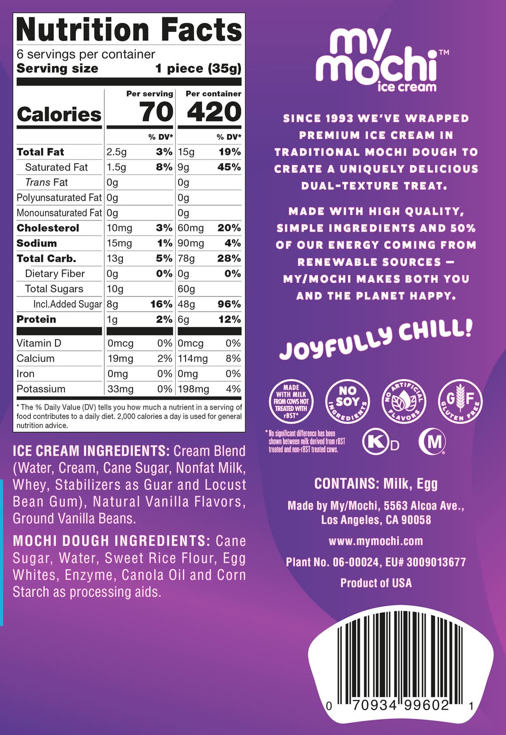 Ingredients: Ice Cream Ingredients: Cream Blend (Water, Cream, Cane Sugar, Nonfat Milk, Whey, Stabilizers as Guar and Locust Bean Gum), Natural Vanilla Flavors, Ground Vanilla Beans. Mochi Dough Ingredients: Cane Sugar, Water, Sweet Rice Flour, Egg Whites, Enzyme, Canola Oil and Corn Starch as Processing Aids Contains: Milk, Eggs, Corn