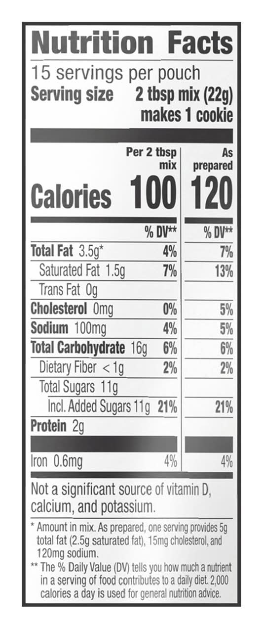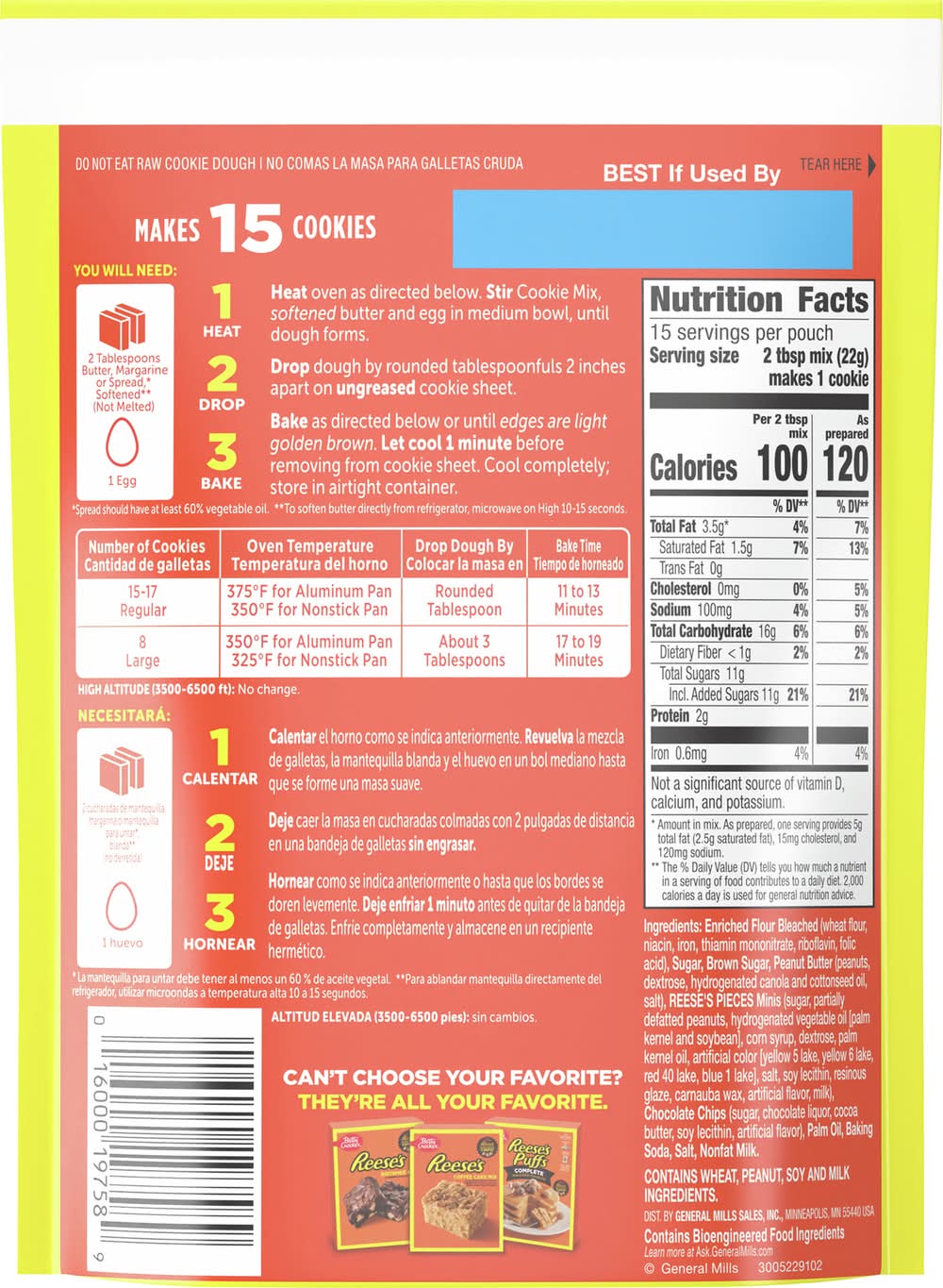 Makes 15 cookies you will need: 2 tablespoons butter, margarine or spread (spread should have at least 60% vegetable oil) softened (to soften butter directly from refrigerator, microwave on high 10-15 seconds) (not melted) 1 egg. 1. heat oven as directed below. stir cookie mix, softened butter and egg in a medium bowl, until dough forms. 2. drop dough by rounded tablespoonfuls 2 inches apart on an ungreased cookie sheet. 3. bake as directed below or until edges are light golden brown. let cool 1 minute before removing from cookie sheet. cool completely; store in airtight container. number of cookies: 15-17 regular; oven temperature: 375 degrees f aluminum pan 350 degrees f for nonstick pan; drop dough by: rounded tablespoon; bake time: 11 to 13 minutes, number of cookies: 8 large; oven temperature: 350 degrees f aluminum pan 325 degrees f nonstick pan; drop dough by: about 3 tablespoons; bake time: 17 to 19 minutes. high altitude (3500-6500 ft): no change. do not eat raw cookie dough.