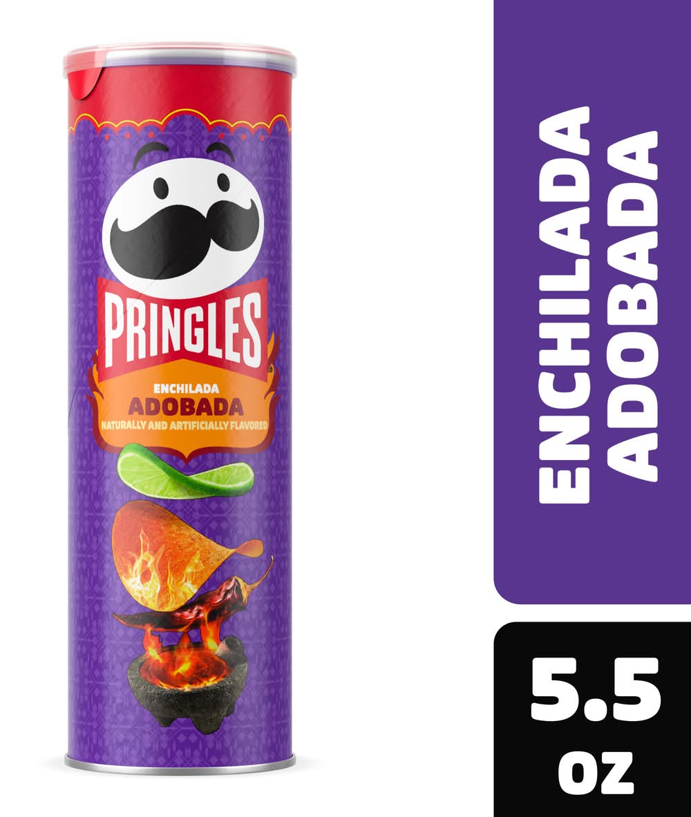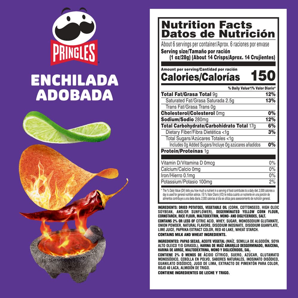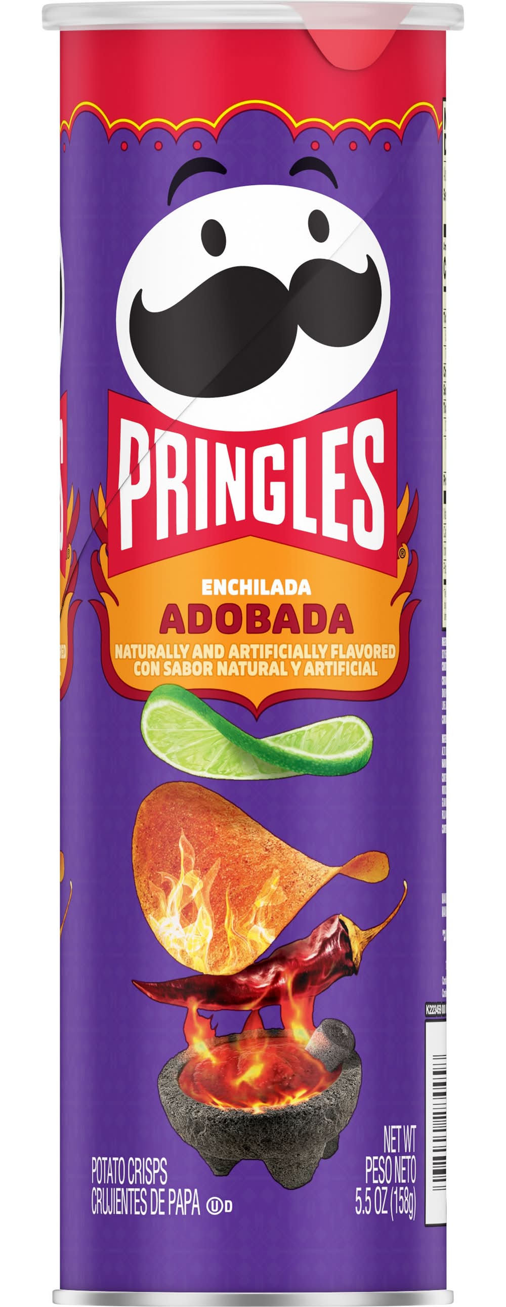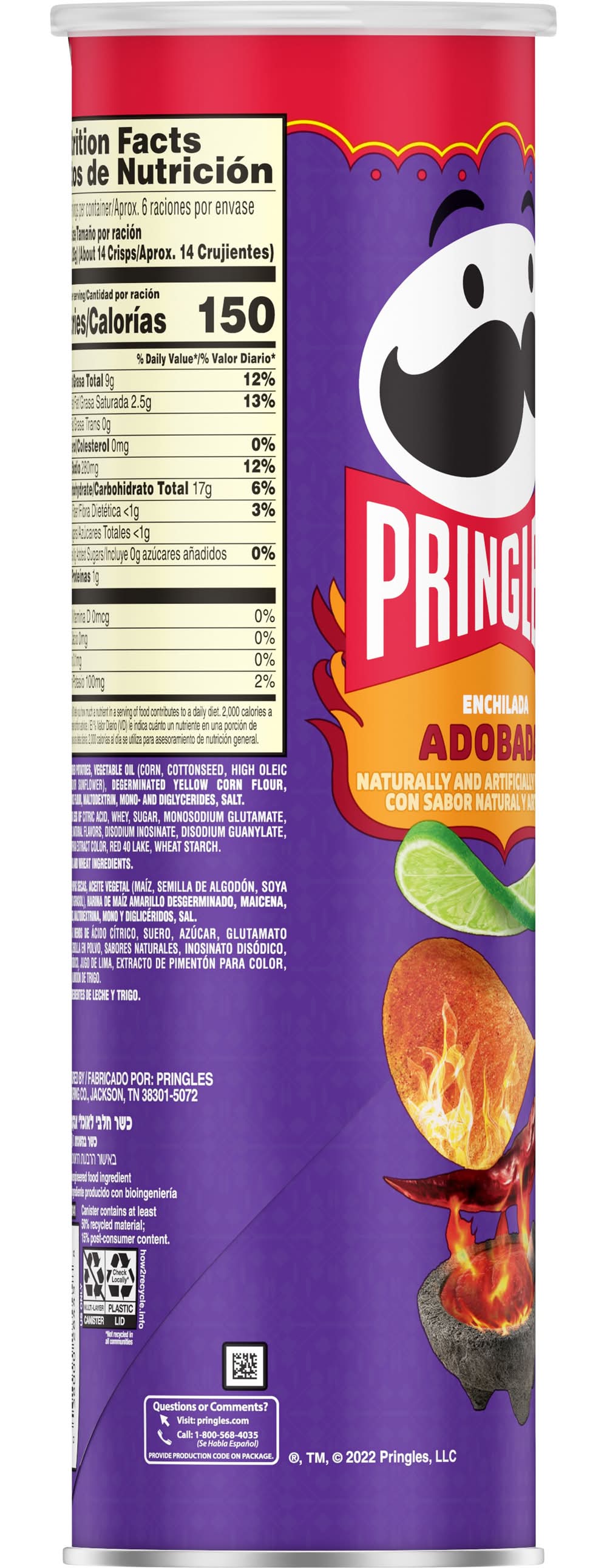 What happens when you combine the taste of spicy Mexican enchiladas with the light, crispy crunch of Pringles? You get a full-on kick of authentic flavor that's outrageously delicious. Each crisp brings a tongue-tingling taste of adobo, hot chili peppers, lime, and salt for a bold taste experience that hits the spot every time. Stacked in a convenient can, Pringles makes it easy to create your own snacking moments whenever and wherever life takes you; Stock your pantry with Pringles as tasty snacks for the whole family. Pop open a can to crank up the flavor when cranking up music or movies. Reach for some when watching sports or playing video games. Serve Pringles as the perfect party food when you're with friends. However you enjoy them, Pringles Enchilada Adobada Potato Crisps bring that tangy, mouthwatering heat that keeps you coming back, stack after stack.