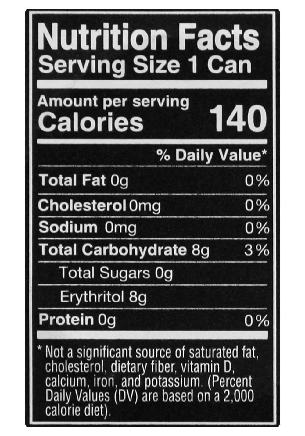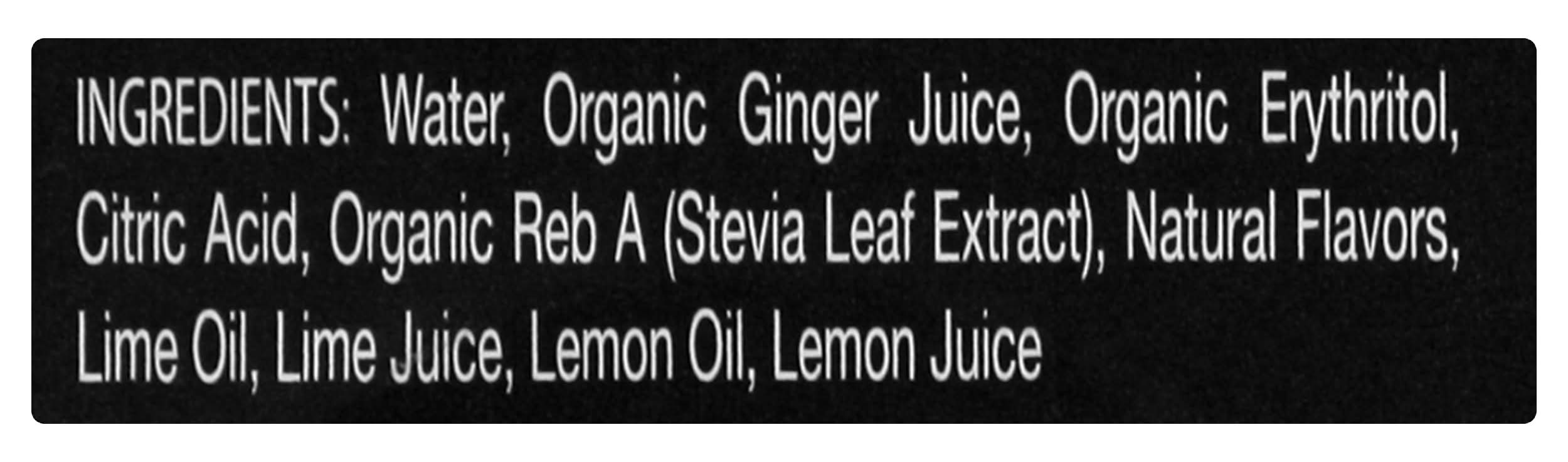 Ingredients: Water, Organic Ginger Juice, Organic Erythritol, Citric Acid, Organic Reb A (Stevia Leaf Extract), Natural Flavors, Lime Oil, Lime Juice, Lemon Oil, Lemon Juice Contains: 'Free From Gluten'