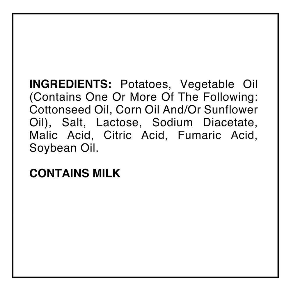 Ingredients: Potatoes, Vegetable Oil (Contains One or More of the Following: Cottonseed Oil, Corn Oil and/or Sunflower Oil), Salt, Lactose, Sodium Diacetate, Malic Acid, Citric Acid, Fumaric Acid, Soybean Oil Contains: Milk, Lactose, Soybeans