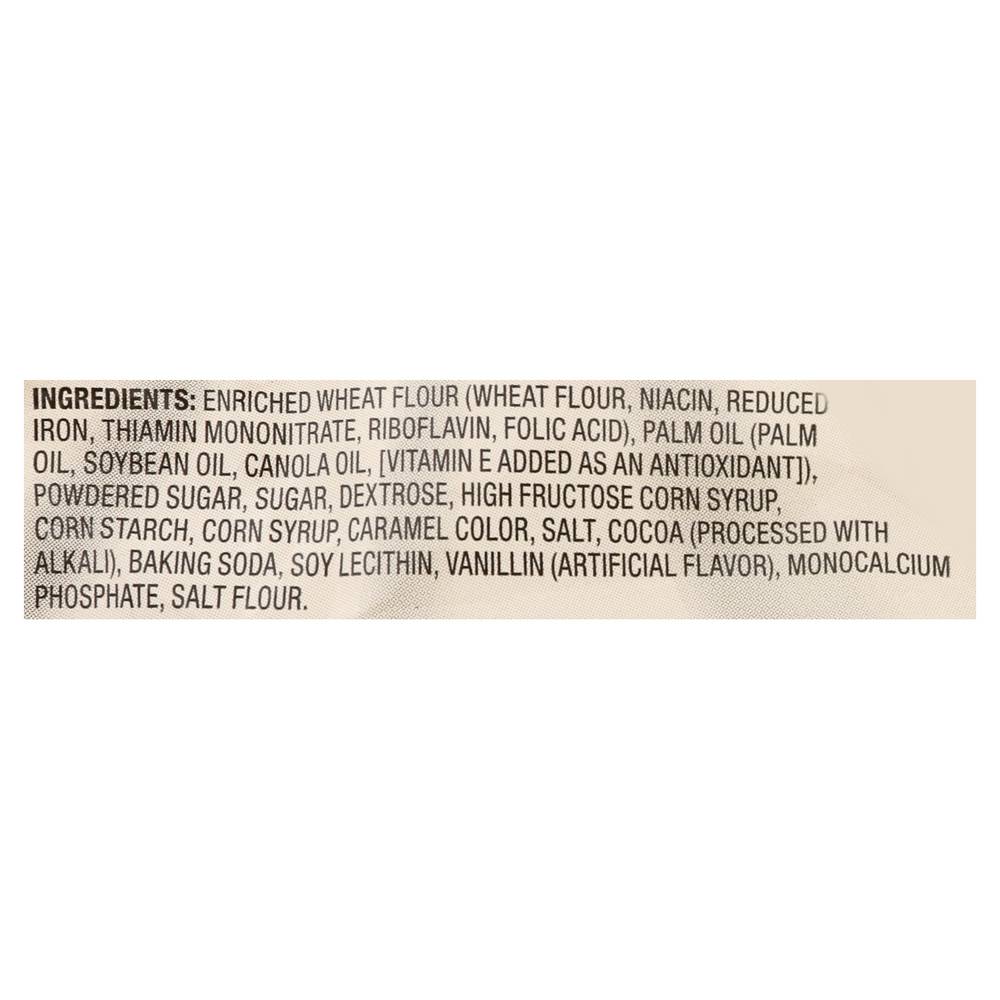 Ingredients: Enriched Wheat Flour (Wheat Flour Niacin Reduced Iron Thiamin Mononitrate Riboflavin Folic Acid), Palm Oil (Palm Oil Soybean Oil Canola Oil [Vitamin E Added as an Antioxidant]), Powdered Sugar, Sugar, Dextrose, High Fructose Corn Syrup, Corn Starch, Corn Syrup, Caramel Color, Salt, Cocoa (Processed with Alkali), Baking Soda, Soy Lecithin, Vanillin (Artificial Flavor), Monocalcium Phosphate, Salt Flour Contains: Soybeans, Wheat