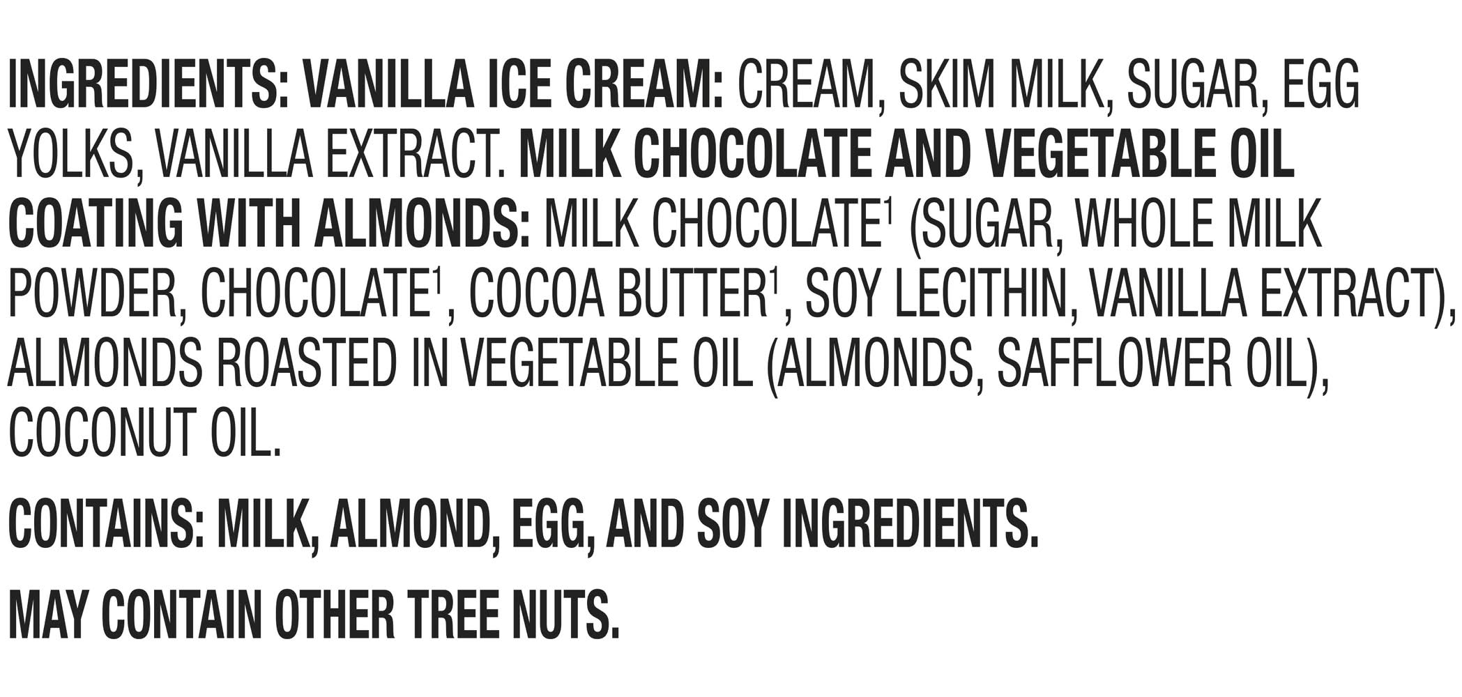 Ingredients: INGREDIENTS: VANILLA ICE CREAM: CREAM, SKIM MILK, SUGAR, EGG YOLKS, VANILLA EXTRACT. MILK CHOCOLAATE AND VEGETABLE OIL COATING WITH ALMONDS: MILK CHOCOLATE (SUGAR; WHOLE MILK POWDER; CHOCOLAATE; COCOA BUTTER; SOY LECITHIN; VANILLA EXTRACT), ALMONDS ROASTED IN VEGETABLE OIL (ALMONDS; SAFFLOWER OIL), COCONUT OIL Contains: CONTAINS: MILK; ALMOND; EGG; AND SOY INGREDIENTS.