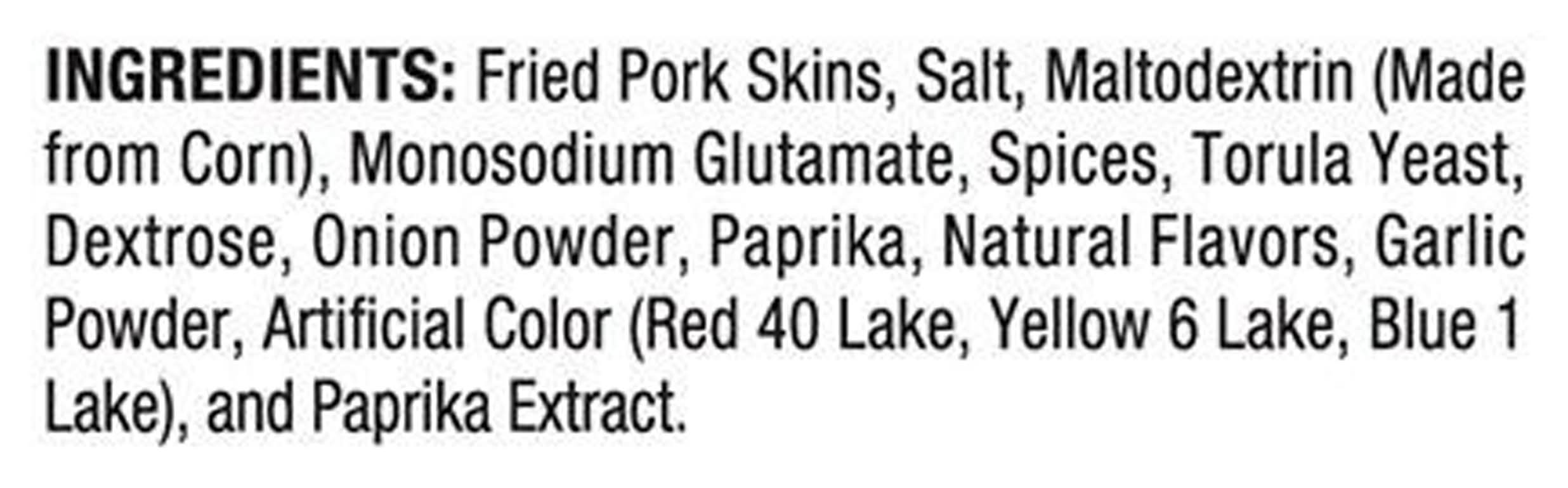 Ingredients: Fried Pork Skins, Salt, Maltodextrin (Made from Corn), Monosodium Glutamate, Spices, Torula Yeast, Dextrose, Onion Powder, Paprika, Natural Flavors, Garlic Powder, Artificial Color (Red 40 Lake, Yellow 6 Lake, Blue 1 Lake), and Paprika Extract