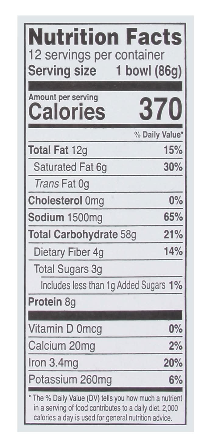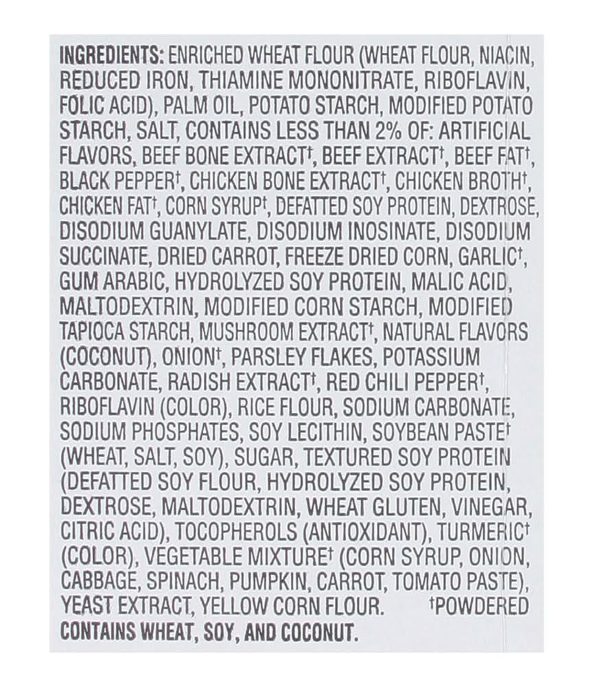 Ingredients: Enriched Wheat Flour (Wheat Flour, Niacin, Reduced Iron, Thiamine Mononitrate, Riboflavin, Folic Acid), Palm Oil, Potato Starch, Modified Potato Starch, Salt, Contains Less than 2% of, Artificial Flavor, Beef Bone Extract (Powdered), Beef Extract (Powdered), Beef Fat (Powdered), Black Pepper (Powdered), Chicken Bone Extract (Powdered), Chicken Broth (Powdered), Chicken Fat (Powdered), Corn Syrup (Powdered), Defatted Soy Flour, Dextrose, Disodium Guanylate, Disodium Inosinate, Disodium Succinate, Dried Carrot, Freeze Dried Corn, Garlic (Powdered), Gum Arabic, Hydrolyzed Soy Protein, Malic Acid, Maltodextrin, Modified Corn Starch, Modified Tapioca Starch, Mushroom Extract (Powdered), Natural Flavors (Coconut), Onion (Powdered), Parsley Flakes, Potassium Carbonate, Radish Extract (Powdered), Red Chili Pepper (Powdered), Riboflavin (Color), Rice Flour, Sodium Carbonate, Sodium Phosphates, Soy Lecithin, Soybean Paste (Powdered) (Wheat, Salt, Soy), Sugar, Textured Soy Protein (Defatted Soy Flour, Hydrolyzed Soy Protein, Dextrose, Water, Maltodextrin, Wheat Gluten, Vinegar, Citric Acid), Tocopherols (Antioxidant), Turmeric (Color), Vegetable Mixture (Corn Syrup, Onion, Cabbage, Spinach, Pumpkin, Carrot, Tomato Paste), Yeast Extract, Yellow Corn Flour Contains: Wheat, Soybeans, Tree Nuts, Coconuts, Corn, Gluten, Milk, Eggs, Peanuts, Fish, Crustacean Shellfish, Sesame