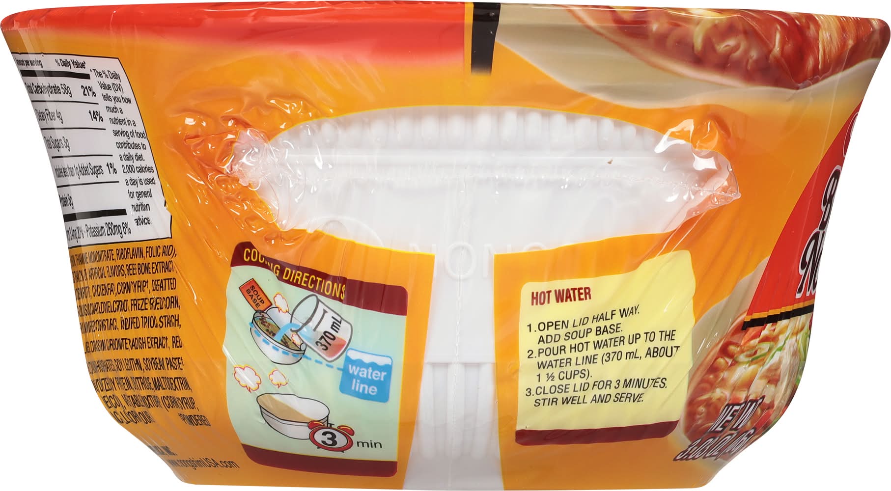 Directions: cooking directions: microwave. cooking time may vary depending on microwave. (1) completely remove lid. add soup base. (2) pour some temperature water up to the water line (370 ml, about 1 1/2 cups). (3) microwave for 3 minutes. stir well and serve. noodle texture: al dente: 3 min. medium: 3-1/2 min. soft: 4 min. hot water: (1) open lid half way. add soup base. (2) pour hot water up to the water line (370 ml, about 1-1/2 cups). (3) close lid for 3 minutes. stir well and serve. caution: product is very hot after heating. handle with care to avoid spilling or burning yourself. never microwave without water.