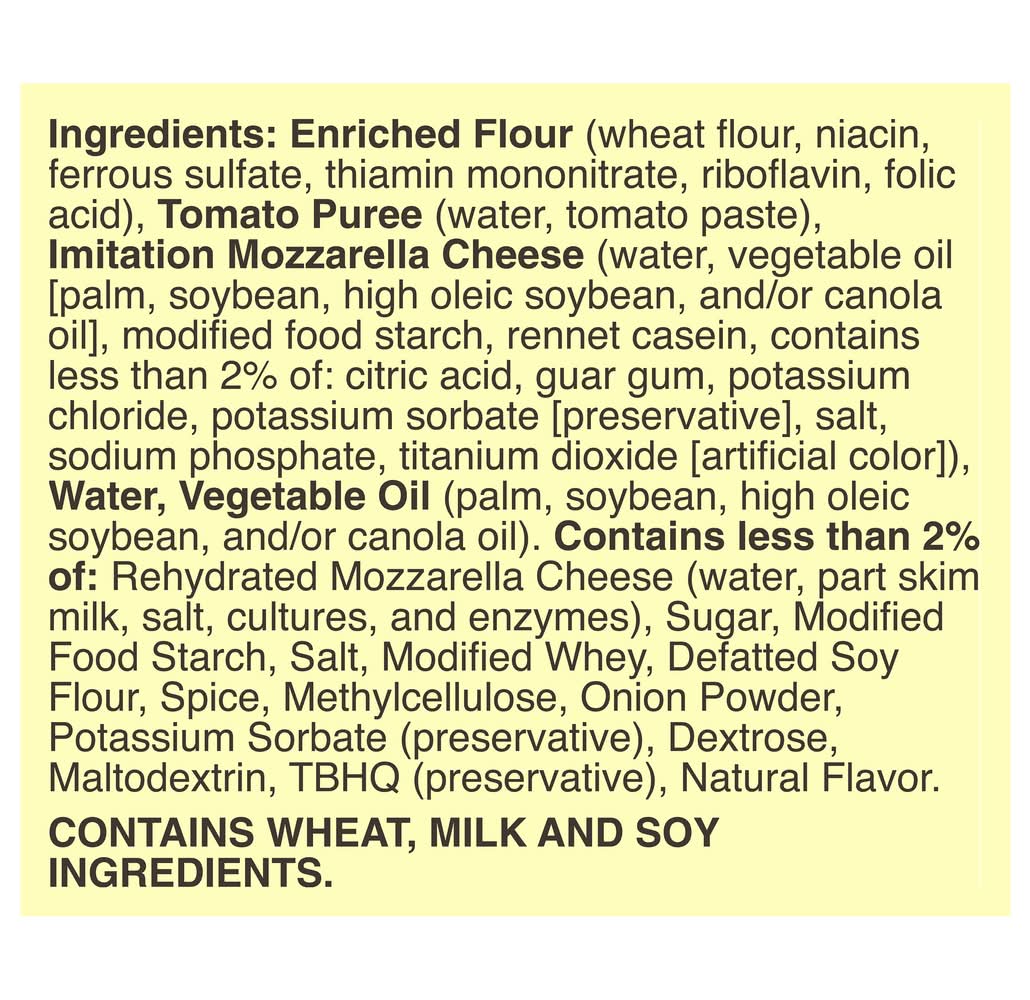 Ingredients: Enriched Flour (Wheat Flour, Niacin, Ferrous Sulfate, Thiamin Mononitrate, Riboflavin, Folic Acid), Tomato Puree (Water, Tomato Paste), Imitation Mozzarella Cheese (Water, Vegetable Oil [Palm, High Oleic Soybean, and/or Canola, Oil], Modified Food Starch, Rennet Casein, Contains Less than 2% of: Citric Acid, Guar Gum, Potassium Chloride, Potassium Sorbate [Preservative], Sodium Phosphate, Titanium Dioxide [Artificial Color]), Water, Vegetable Oil (Palm, High Oleic Soybean, and/or Canola Oil), Contains Less than 2% of: Rehydrated Mozzarella Cheese (Water, Part Skim Milk, Cultures, and Enzymes), Sugar, Modified Food Starch, Modified Whey, Defatted Soy Flour, Spice, Methylcellulose, Onion Powder, Potassium Sorbate (Preservative), Dextrose, Maltodextrin, TBHQ (Preservative), Natural Flavor Contains: Wheat, Milk, Soybeans