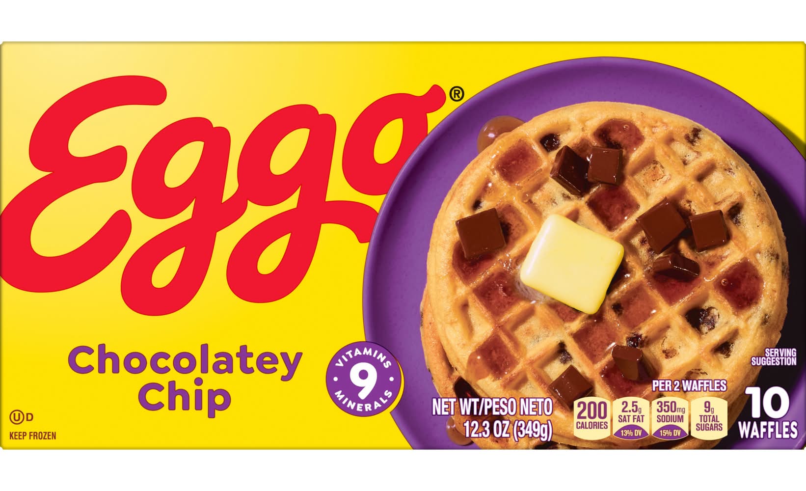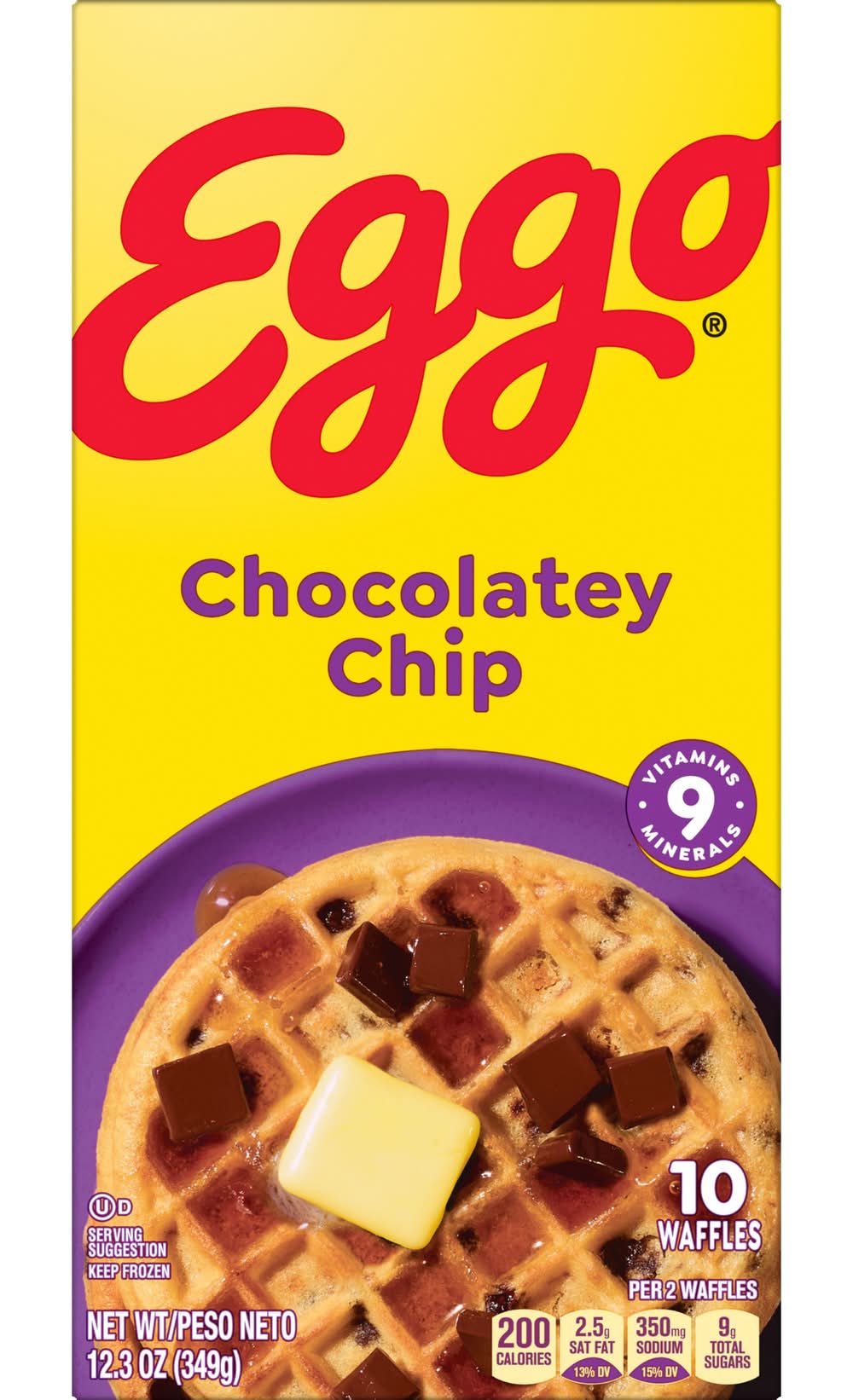 Wake up and greet the day with a true classic! Chocolatey Chip waffles are crispy-on-the-outside and fluffy-on-the-inside – just the way you remember them. Crafted with delicious ingredients and the sweet taste of chocolatey chips, these frozen waffles couldn’t be easier to make. Pop them in the toaster or oven for a delightfully crisp texture and familiar, inviting homemade taste. Feel good about what you’re serving your family; 2 waffles provide a good source of 9 vitamins and minerals. These scrumptious waffles are made to enjoy as part of a delicious breakfast. They help bring warmth and smiles to a fast-paced, busy morning or a relaxed weekend brunch. They’ve been filling kitchens with sweet aromas and warm memories for decades. Try them with your favorite toppings such as butter and syrup, jelly or jam, fresh fruit, whipped cream, or powdered sugar. No matter how you top , it’s always an moment. • Flavor: Chocolatey chip • Kellogg Sales Co., Battle creek,MI,49016