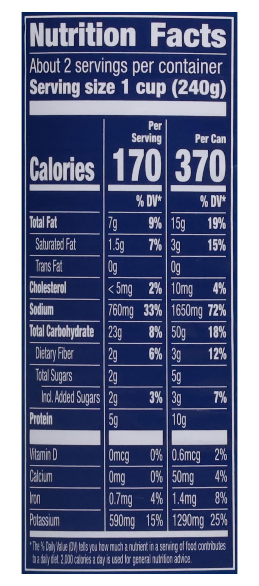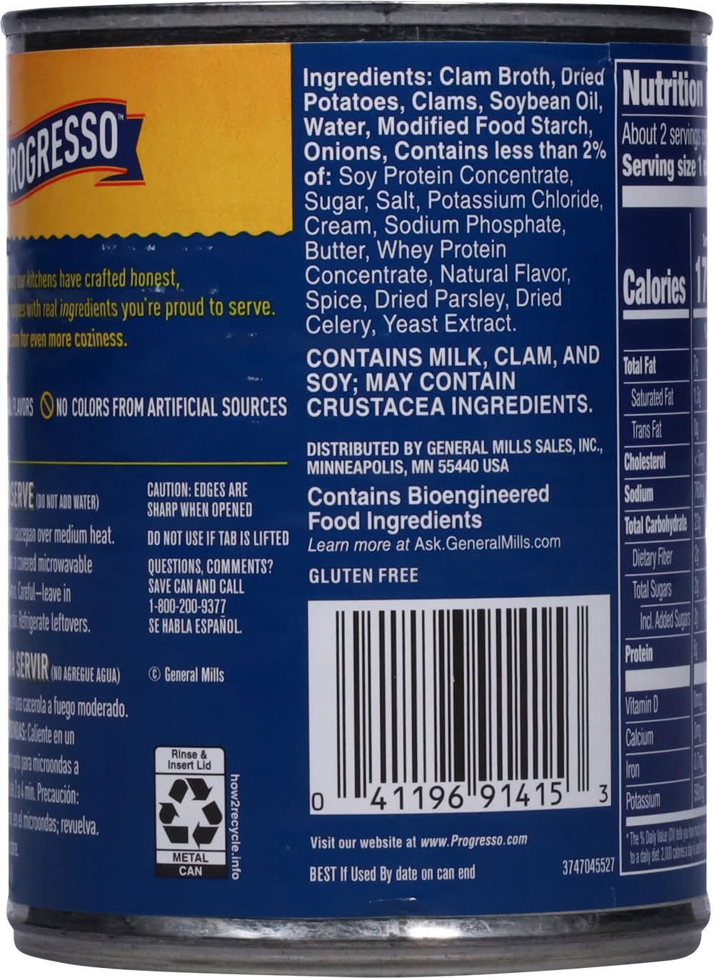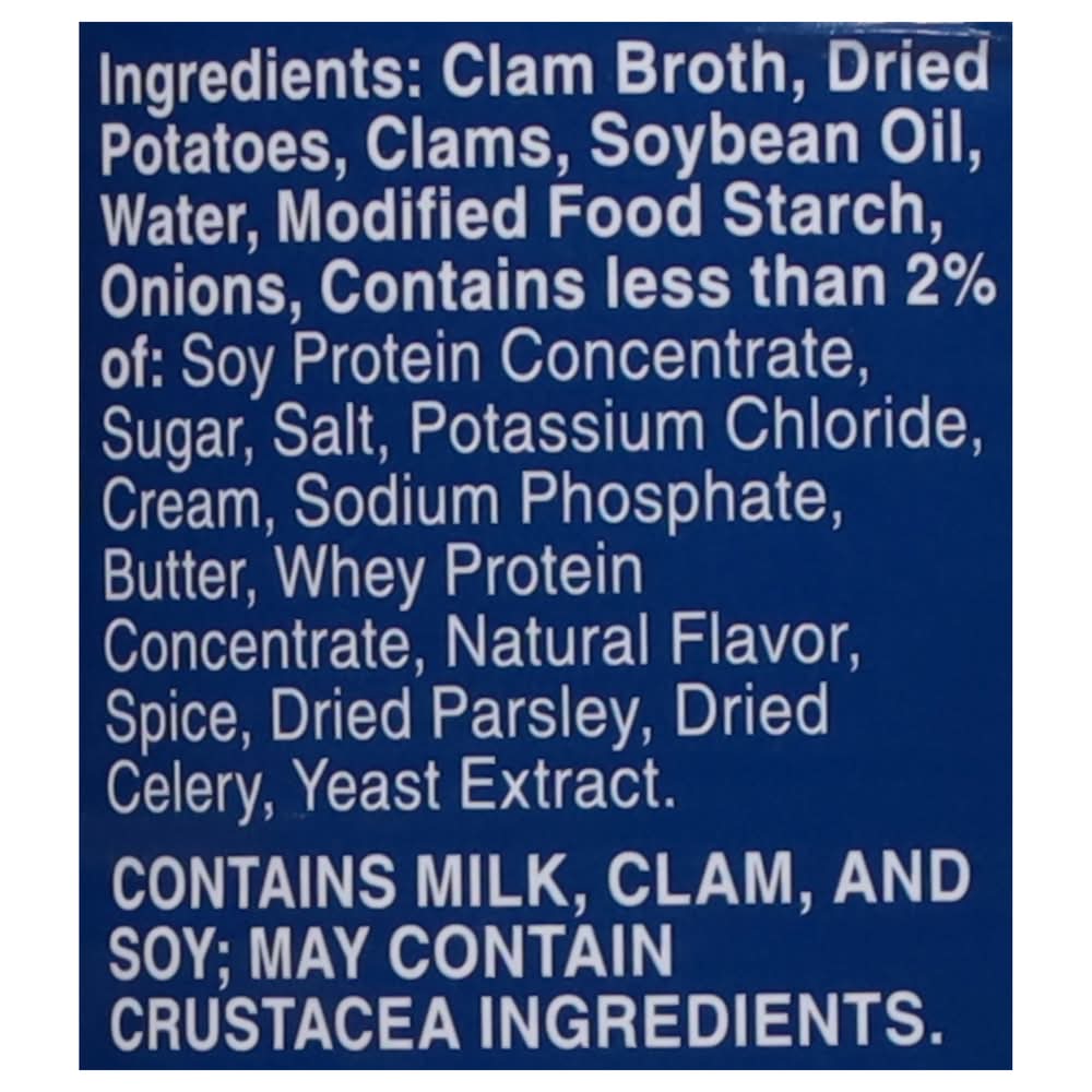 Ingredients: Clam Broth, Dried Potatoes, Clams, Soybean Oil, Water, Modified Food Starch, Onions, Contains Less than 2% of: Soy Protein Concentrate, Sugar, Salt, Potassium Chloride, Cream, Sodium Phosphate, Butter, Whey Protein Concentrate, Natural Flavor, Spice, Dried Parsley, Dried Celery, Yeast Extract Contains: Milk, Molluscan Shellfish, Clam, Soybeans, Celery, Crustacean Shellfish
