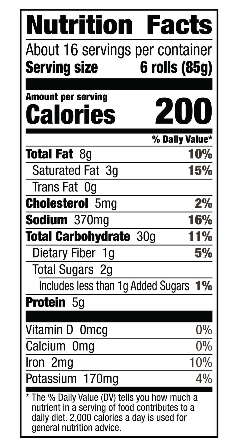Directions for use: Cook thoroughly. Classic: Oven & Toaster Oven: Do not leave toaster oven unattended while cooking product. (1) Heat oven to 425 degree F. (2) Place rolls in single layer on baking sheet or toaster oven tray. Bake according to chart. (3) Let stand 2 minutes to complete cooking. Filling will be very hot. Be cautious on first bite. 20 rolls (quantity): 10 to 12 minutes (oven); 13 to 15 minutes (toaster oven). 40 rolls (quantity): 13 to 15 minutes (oven); Not recommended (toaster oven). Fast: Microwave: Do not leave microwave unattended while cooking product. (1) Place rolls in single layer on microwavable plate. (2) Microwave on high according to chart. Quantity: 1 serving (6 rolls). Time on High: 1:00 to 1:15. 2 servings (12 rolls). Time on High: 2:00 to 2:40. (3) Let stand 2 minutes to completed cooking. Filling will be very hot. Be cautious on first bite. Crispy: Air Fryer: Do not leave air fryer unattended while cooking product. (1) Place up to 25 rolls in single layer in air fryer basket. (2) Cook 4 minutes at 390 degrees F. Remove basket, shake well to mix rolls. Cook an additional 4 minutes. (3) Let stand 2 minutes to complete cooking. Filling will be very hot. Be cautious on first bite. Directions developed using 4-quart air fryers; cooking times may need to be adjusted. Caution: Filling will be very hot! Wait until cool enough to eat. Directions: For food safety and quality follow cooking directions. Cook thoroughly to internal temperature of at least 160 degrees F. Keep frozen until ready to cook. Refrigerate leftovers. Keep frozen. Storage recommendation: Keep frozen.