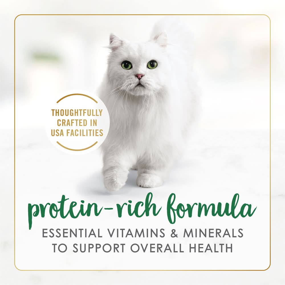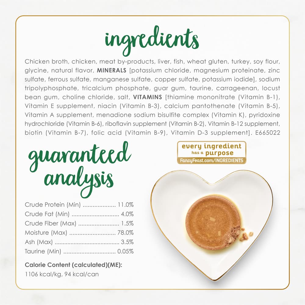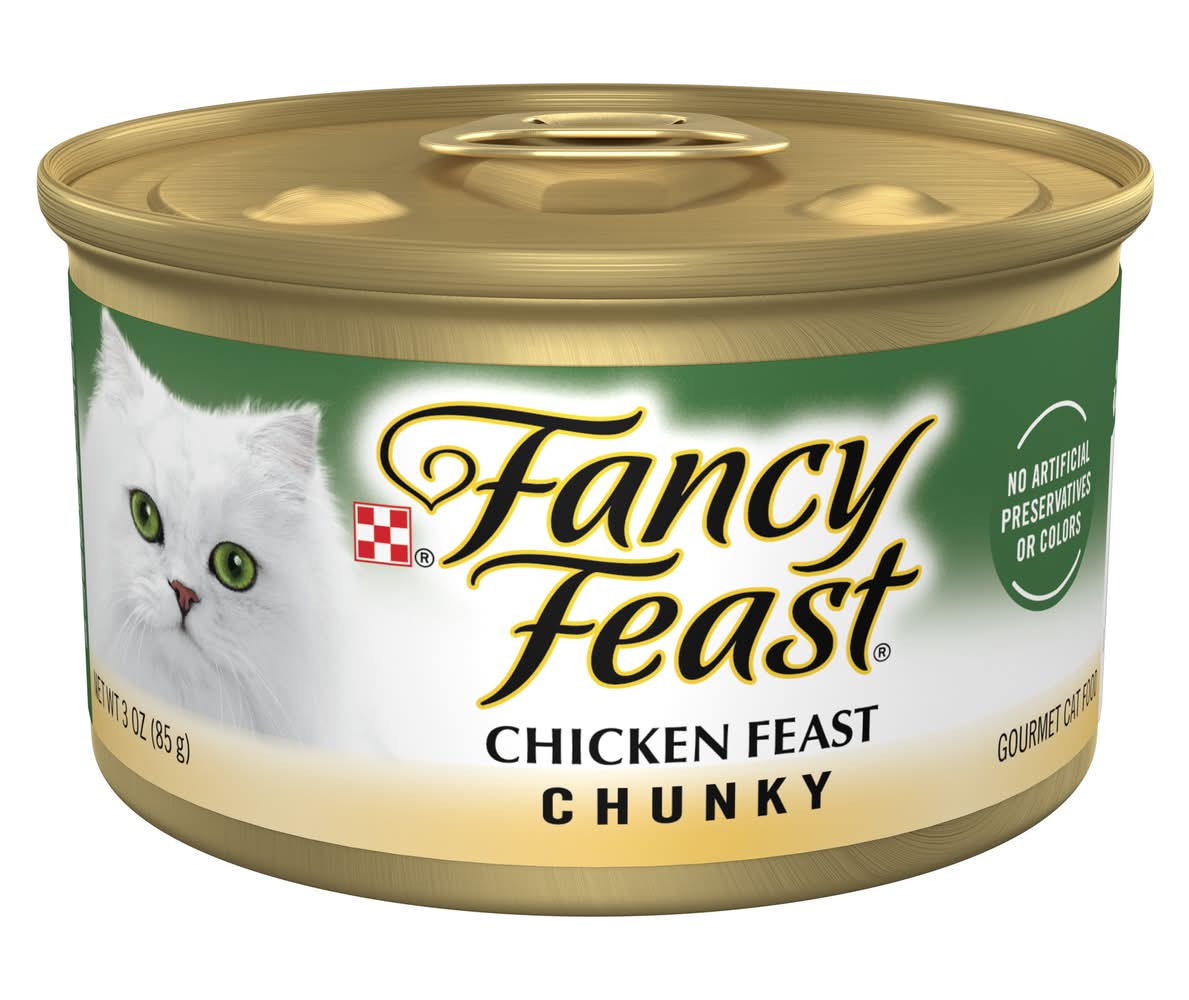 Entice your cat with an exceptional, protein-rich mealtime experience with Succulent chunks with real chicken surrounded in a finely ground cat food wet pate provide a palate-pleasing combination of textures your cat will love, and the high-quality ingredients in this Fancy Feast cat food deliver an irresistible taste in every mouthwatering bite. With its appealing aroma, this high-quality, gourmet wet cat pate keeps your cat engaged during feedings and provides 100 percent complete and balanced nutrition. Essential vitamins for cats and minerals help to support her overall health and wellness, so you can feel good about the foods you put in her dish. Made without artificial colors or preservatives, this canned cat food has everything your cat needs and nothing they don’t. This wet food for cats is crafted in partnership with our expert nutritionists and crafted for quality and safety in Purina-owned US facilities.