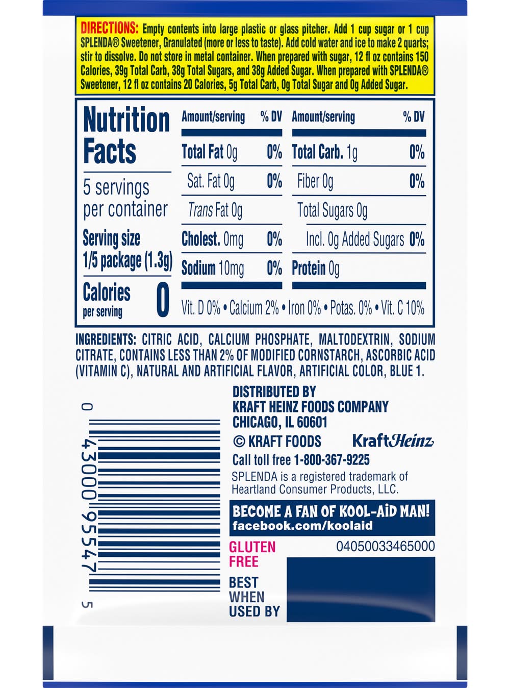 Quench your thirst with the refreshing taste of Kool-Aid Unsweetened Blue Raspberry Lemonade Artificially Flavored Powdered Drink Mix. Unsweetened powdered mix makes it easy to prepare a tasty lemonade. Our artificially flavored powdered drink mix is caffeine-free, a good source of vitamin C, and a great choice for the whole family. Each handy packet of unsweetened mix ensures that you always have a refreshing beverage ready to go. • Flavor: Blue raspberry lemonade • Kraft Heinz Foods Company, Chicago,IL,60601