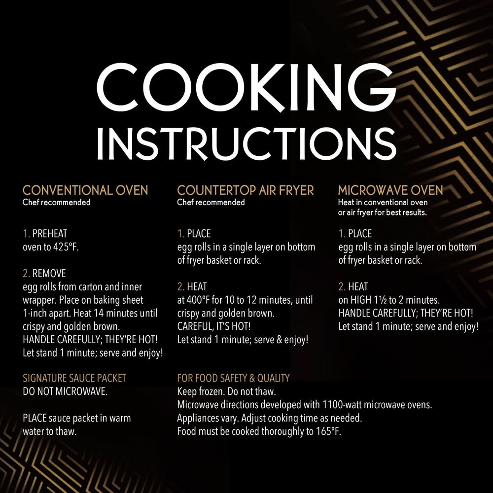 Directions for use: Heating Instructions: For food safety & quality. Keep frozen. Do not thaw. Microwave directions developed with 1100-watt microwave ovens. Appliances vary. Adjust heating time as needed. Conventional Oven: Chef recommended. 1. Preheat oven to 425 degrees F. 2. Remove egg rolls from carton and inner wrapper. Place on baking sheet 1-inch apart. Heat 14 minutes until crispy and golden brown. Handle carefully; they're hot! Let stand 1 minute; serve and enjoy! Microwave Oven: Bake in conventional oven for best result. 1. Place 4 egg rolls on a microwave-safe plate. 2. Microwave on high 1 1/2 to 2 minutes. handle carefully; they're hot! Let stand 1 minute; serve and enjoy! Signature Sauce Packet: Do not microwave. Place sauce packet in warm water to thaw. Keep frozen. Storage recommendation: Keep frozen.