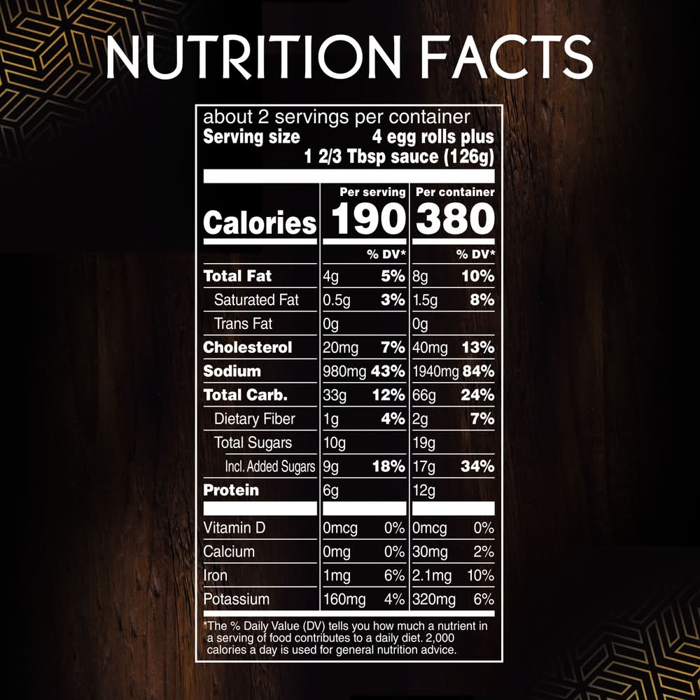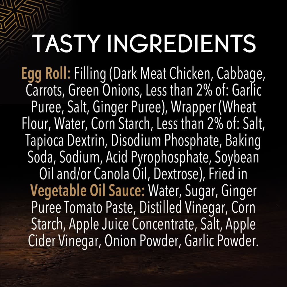 Ingredients: Egg Roll: Filling Dark Meat Chicken, Cabbage, Carrots, Green Onions, Less than 2% of: Garlic Puree, Salt, Ginger Puree, Wrapper Wheat Flour, Water, Corn Starch, Less than 2% of: Salt, Tapioca Dextrin, Disodium Phosphate, Baking Soda, Sodium Acid Pyrophosphate, Soybean Oil and/or Canola Oil, Dextrose, Fried in Vegetable Oil. Sauce: Water, Sugar, Ginger Puree, Tomato Paste, Distilled Vinegar, Corn Starch, Apple Juice Concentrate, Salt, Apple Cider Vinegar, Onion Powder, Garlic Powder. Contains: Egg, Wheat