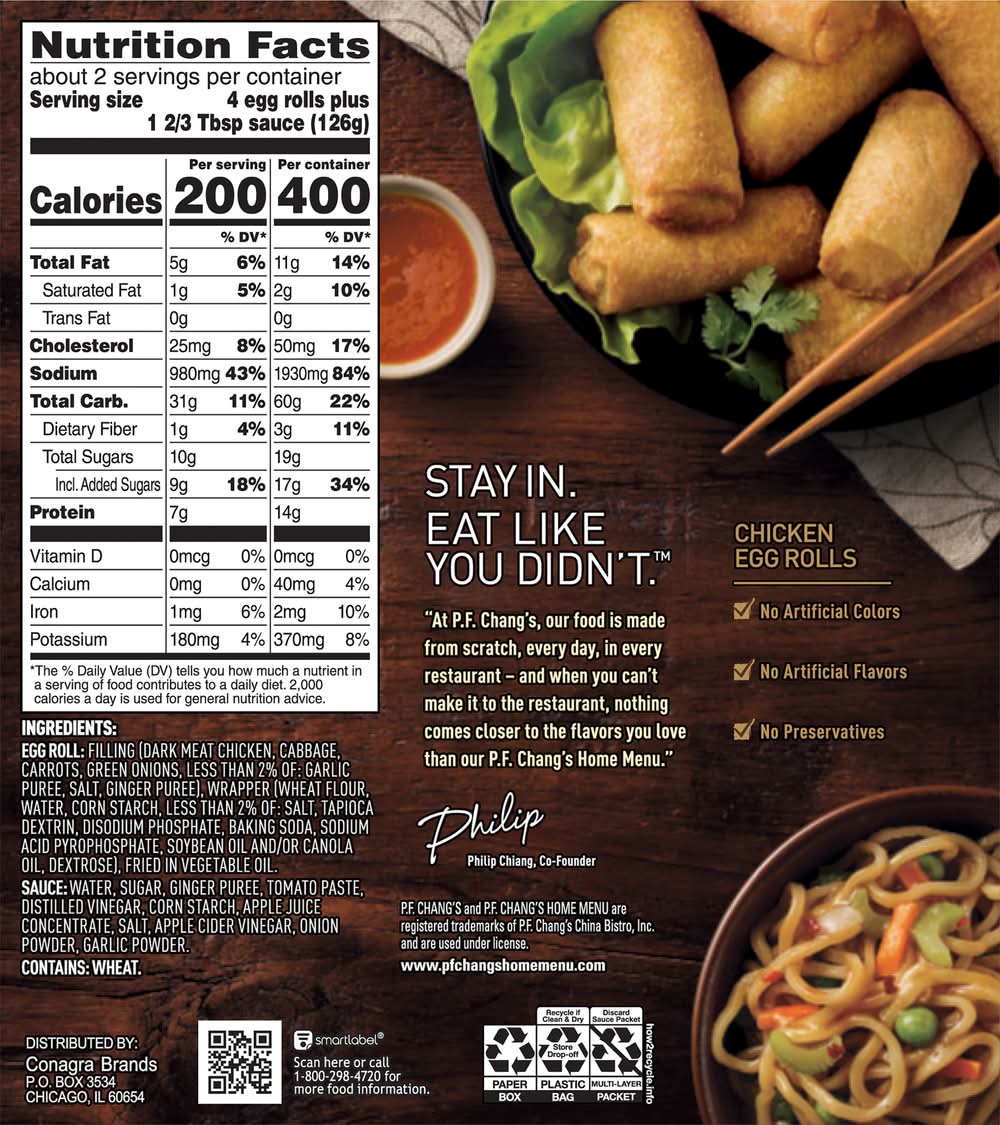 P.F. Chang's Home Menu Chicken Egg Rolls frozen appetizers brings delicious restaurant-inspired food into your home. The frozen egg rolls are filled with chicken, shredded cabbage and carrots. Included with the egg rolls is a signature sweet and sour sauce for dipping, so you can create the perfect bite. P.F. Chang's Home Menu Chicken Egg Rolls are made with no artificial colors, flavors or preservatives, ensuring delicious and satisfying frozen appetizers and side dishes every time. Pair the frozen appetizers with P.F. Chang's Home Menu Skillet Meals and rice for a perfect Asian-inspired dining experience at home. The mini egg rolls are great for enjoying on their own as an appetizer or frozen snack, but they also make excellent frozen sides for your dinner whenever you want something special. Stay in. Eat like you didn't. Far from ordinary, P.F. Chang's Home Menu creates a gourmet Asian experience in your own kitchen. Simple, fresh ingredients balance one another to bring out all the best flavors that’s how easy Asian food is done • Conagra Brands, P.O. Box 3534,Chicago,IL,60654 • Packaging: Reusable
