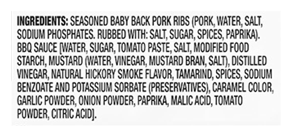 Ingredients: Seasoned Baby Back Pork Ribs (Pork, Water, Salt, Sodium Phosphates, Rubbed with: Salt, Sugar, Spices, Paprika) BBQ Sauce [Water, Sugar, Tomato Paste, Salt, Modified Food Starch, Mustard (Water, Vinegar, Mustard Bran, Salt), Distilled Vinegar, Natural, Hickory Smoke Flavor, Tamarind, Spices, Sodium Benzoate and Potassium Sorbate (Preservatives), Caramel Color, Garlic Powder, Onion Powder, Paprika, Malic Acid, Tomato Powder, Citric Acid] Contains: Mustard, Tree Nuts, Hickory Nuts