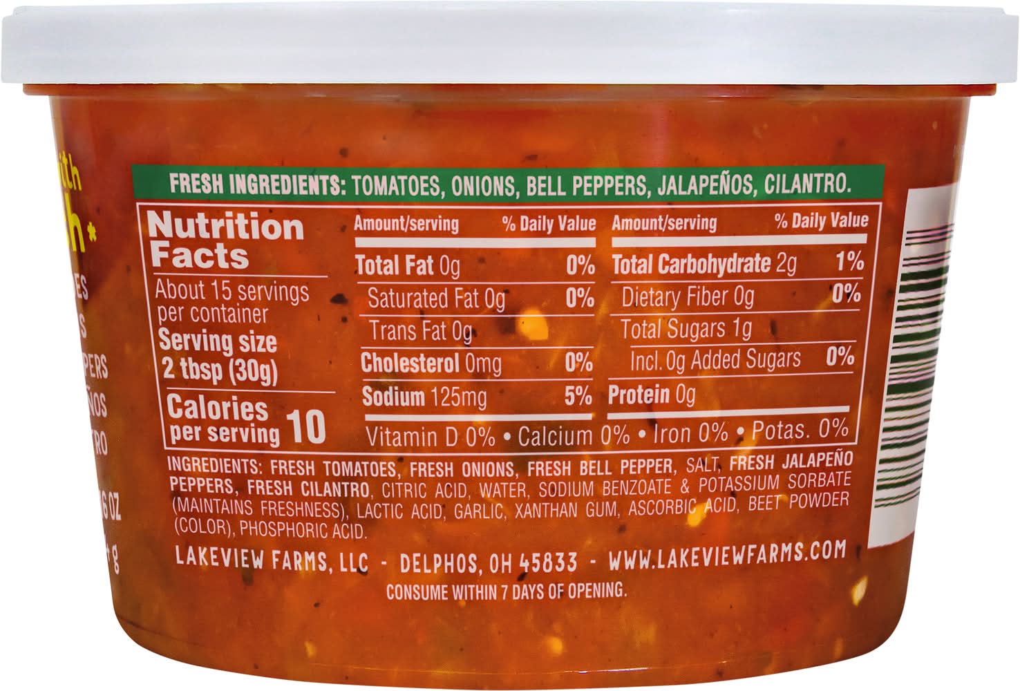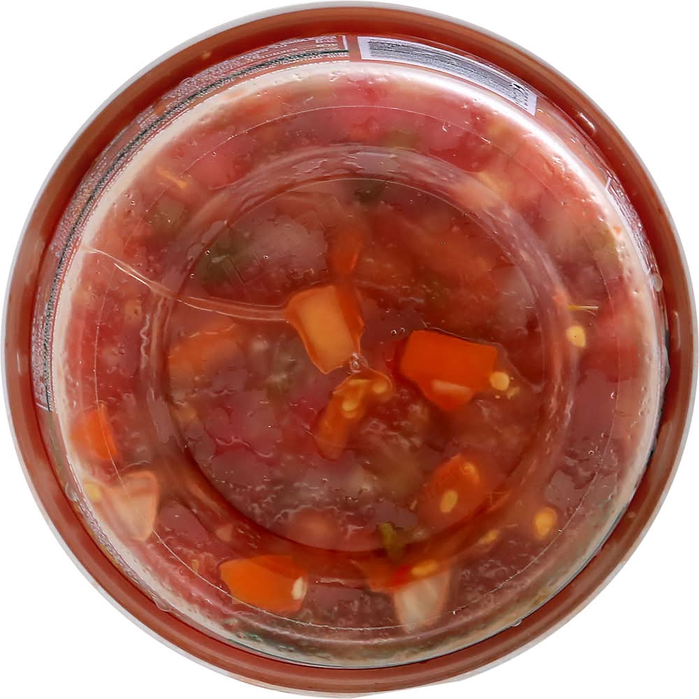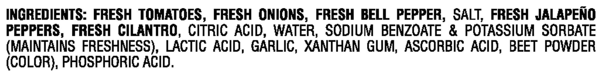 Ingredients: Fresh Tomatoes, Fresh Onions, Fresh Bell Pepper, Salt, Fresh Jalapeno Peppers, Fresh Cilantro, Citric Acid, Water, Sodium Benzoate & Potassium Sorbate (Maintains Freshness), Lactic Acid, Garlic, Xanthan Gum, Ascorbic Acid, Beet Powder (Color), Phosphoric Acid