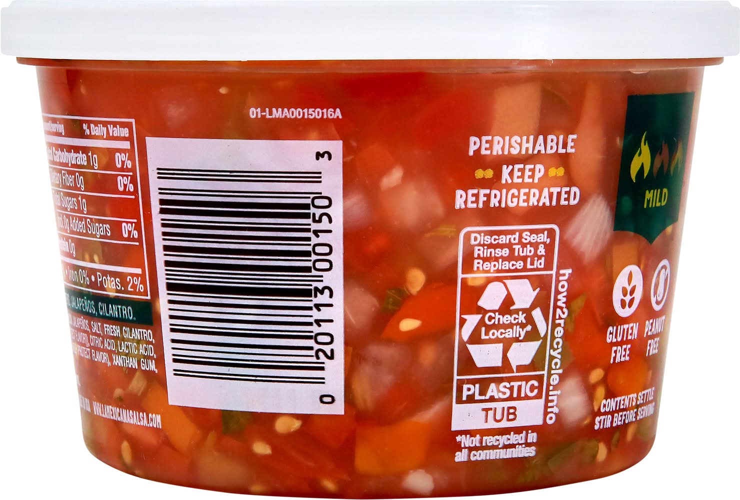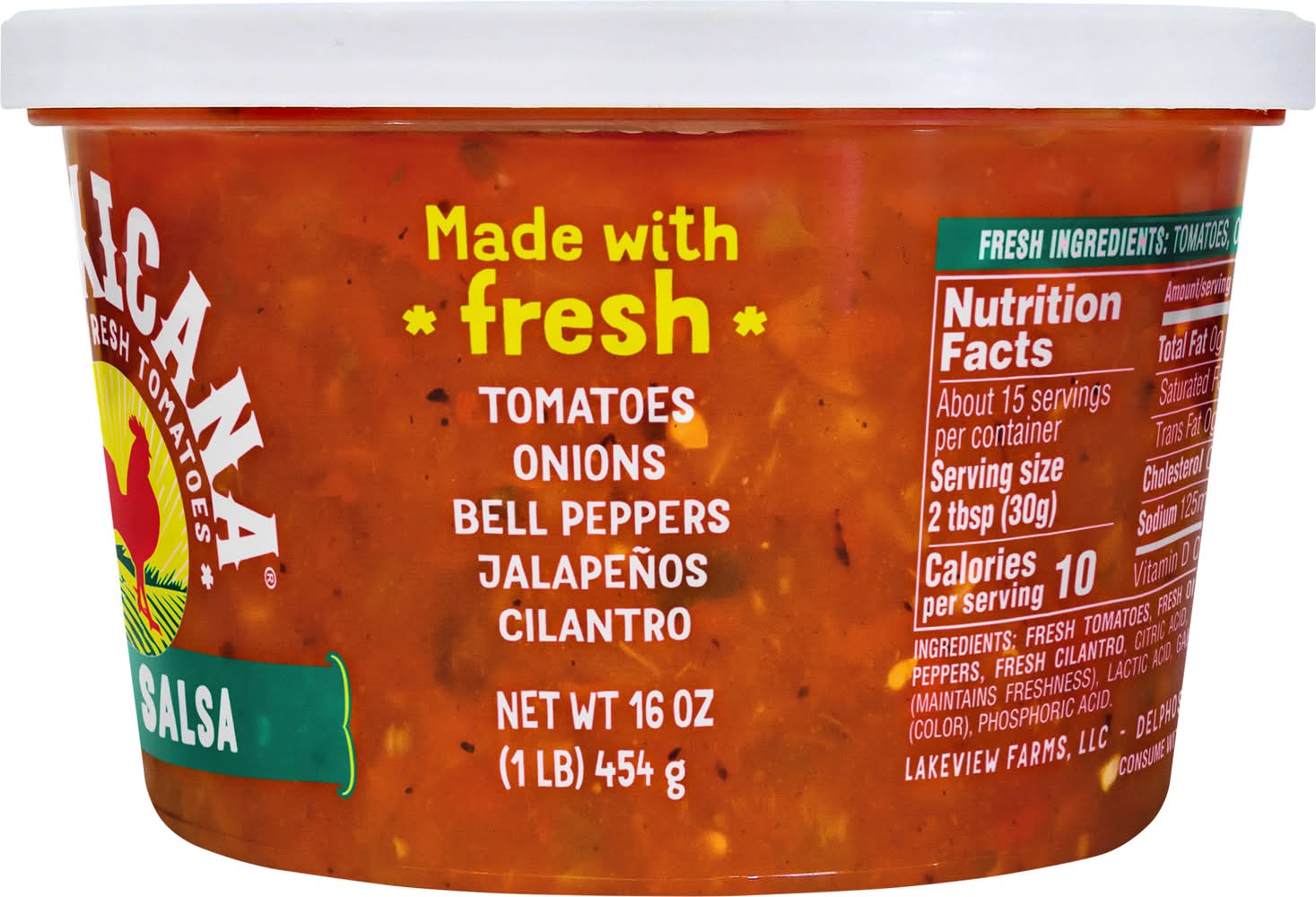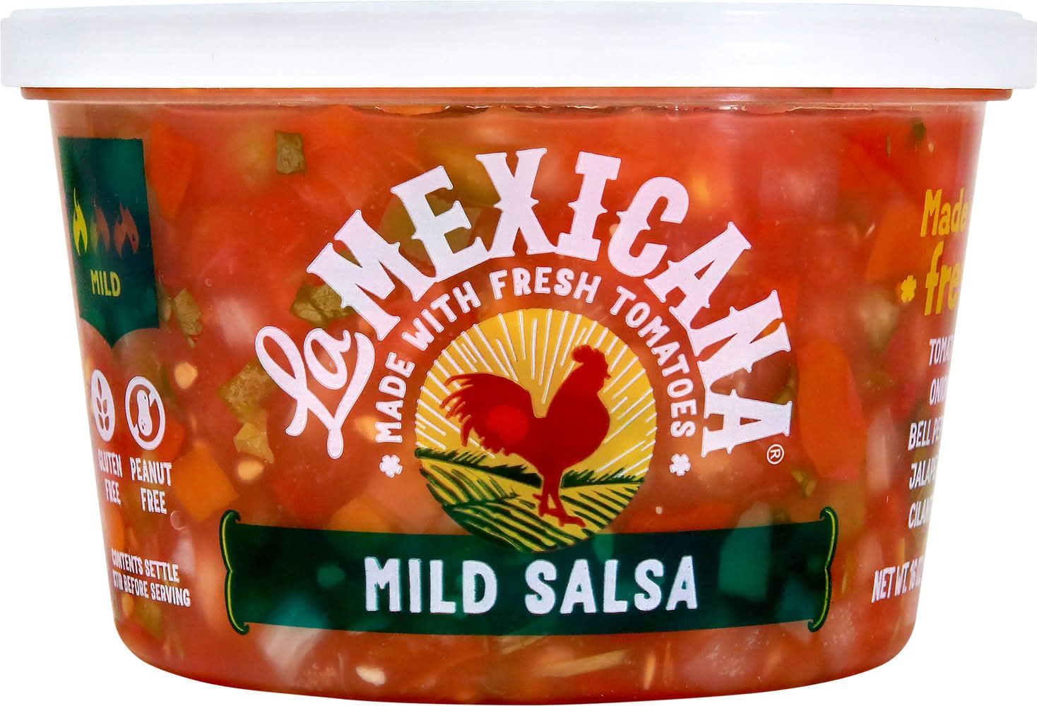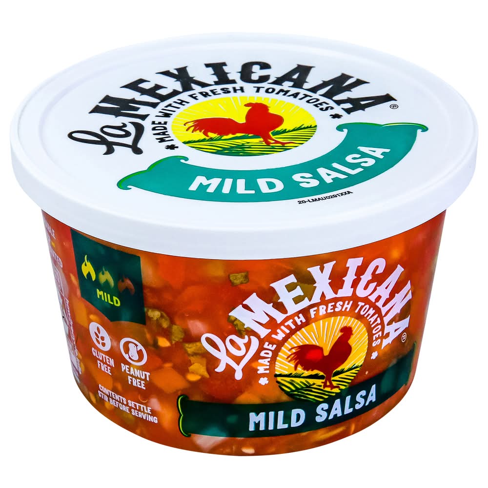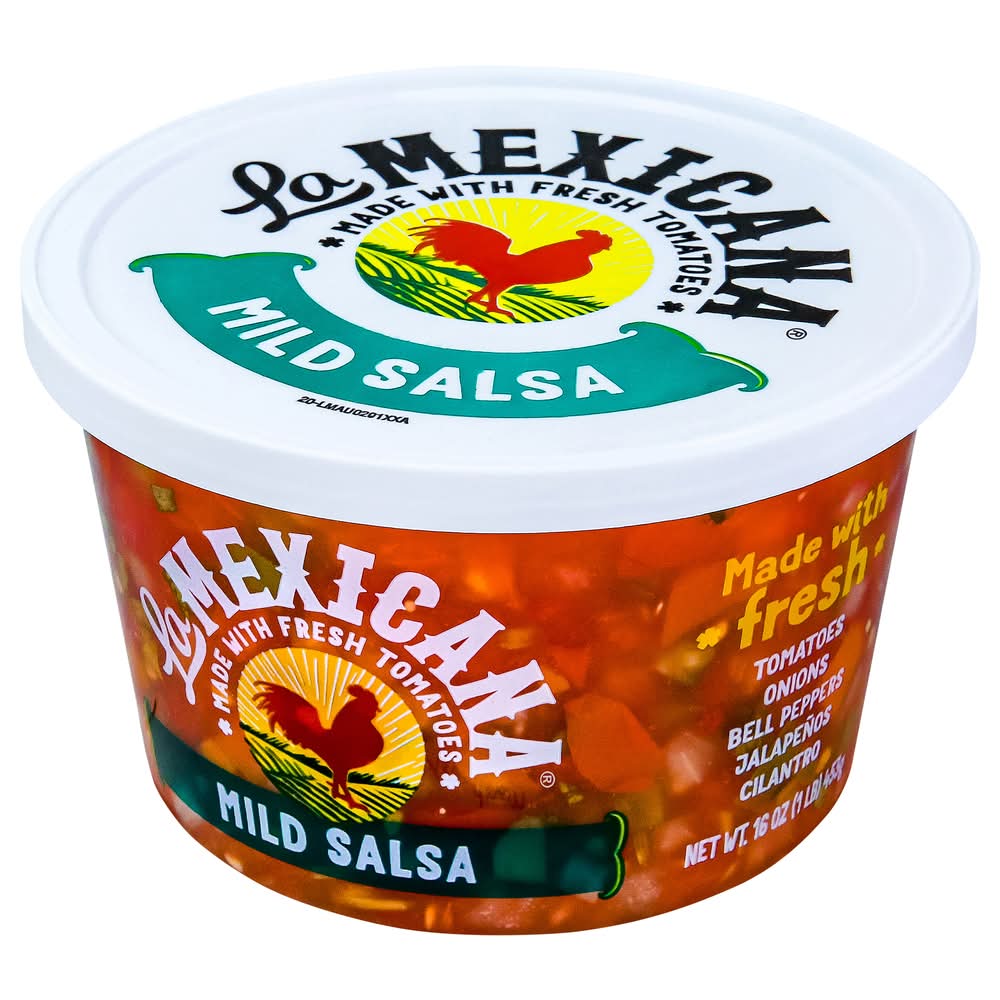 La Mexicana Mild Salsa 16oz, Fresh tomatoes, onions, bell peppers, jalapenos and cilantro combine in a mild, chunky salsa for the perfect blend of spice and flavor. Perfect for dipping or used as an ingredient to add excitement to everyday dishes. • Flavor: Mild • La Mexicana, South Gate,CA,90280 • Packaging: Reusable