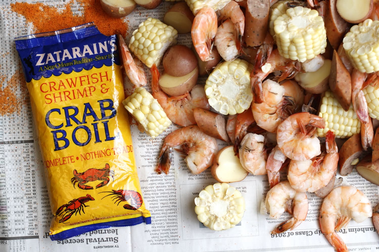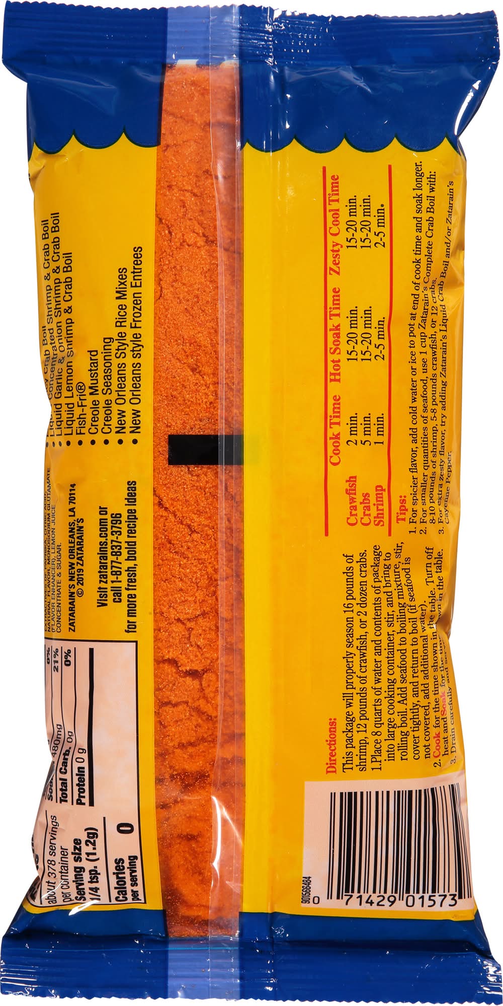 Directions: this package will properly season 16 pounds of shrimp, 12 pounds of crawfish, or 2 dozen crabs. 1. place 8 quarts of water and contents of package into large cooking container, stir, and bring to rolling boil. add seafood to boiling mixture, stir, cover tightly, and return to boil (if seafood is not covered, add additional water). 2. cook for the time shown in the table. turn off heat and soak for the time shown in the table. 3. drain carefully and serve. craw fish: cook time - 2 min.; hot soak time - 15-20 min.; zesty cook time - 15-20 min. crabs: cook time - 5 min.; hot soak time - 15-20 min.; zesty cook time - 15-20 min. shrimp: cook time - 1 min.; hot soak time - 2-5 min.; zesty cook time - 2-5 min. tips: 1. for spicier flavor, add cold water or ice to pot at end of cook time and soak longer. 2. for smaller quantities of seafood, use 1 cup zatarain's complete crab boil with: 8-10 pounds of shrimp, 5-8 pounds crawfish, or 12 crabs. 3. for extra zesty flavor, try adding zatarain's liquid crab boil and/or zatarain's cayenne pepper.