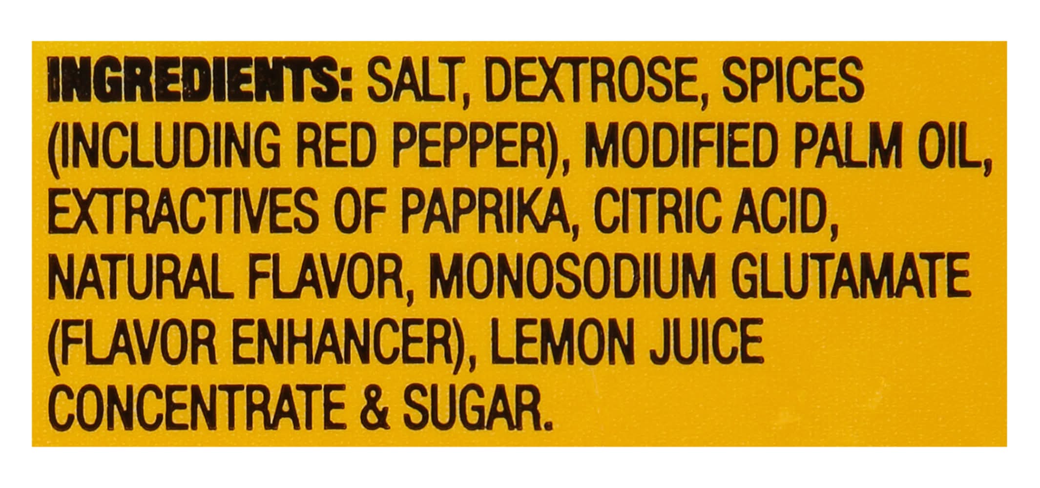 Ingredients: Salt, Dextrose, Spices (Including Red Pepper), Modified Palm Oil, Extractives of Paprika, Citric Acid, Natural Flavor, Monosodium Glutamate (Flavor Enhancer), Lemon Juice Concentrate Sugar.