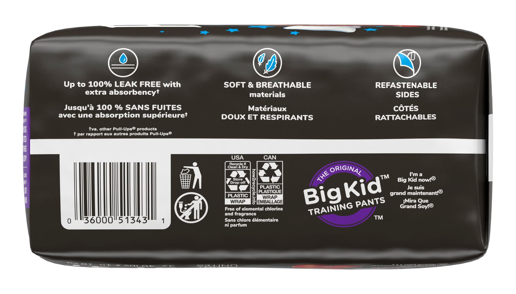 Pull-Ups Boys' Night-Time Potty Training Pants are designed for toddlers weighing between 32-40 pounds. Reliable protection during the night, ensuring a comfortable and secure fit for your child. • Size: 3T-4T • Kimberly-Clark Global Sales, LLC, Neenah,WI,54956 • Packaging: Reusable