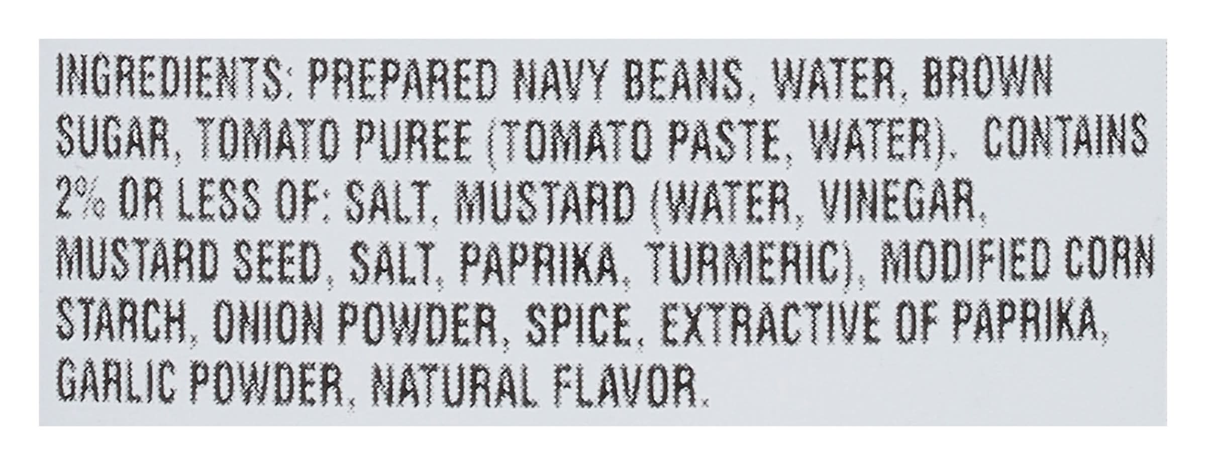 Ingredients: Prepared Navy Beans, Water, Brown Sugar, Tomato Puree (Tomato Paste, Water). Contains 2% or Less of: Salt, Mustard (Water, Vinegar, Mustard Seed, Salt, Paprika, Turmeric), Modified Corn Starch, Onion Powder, Spice, Extractive of Paprika, Garlic Powder, Natural Flavor.